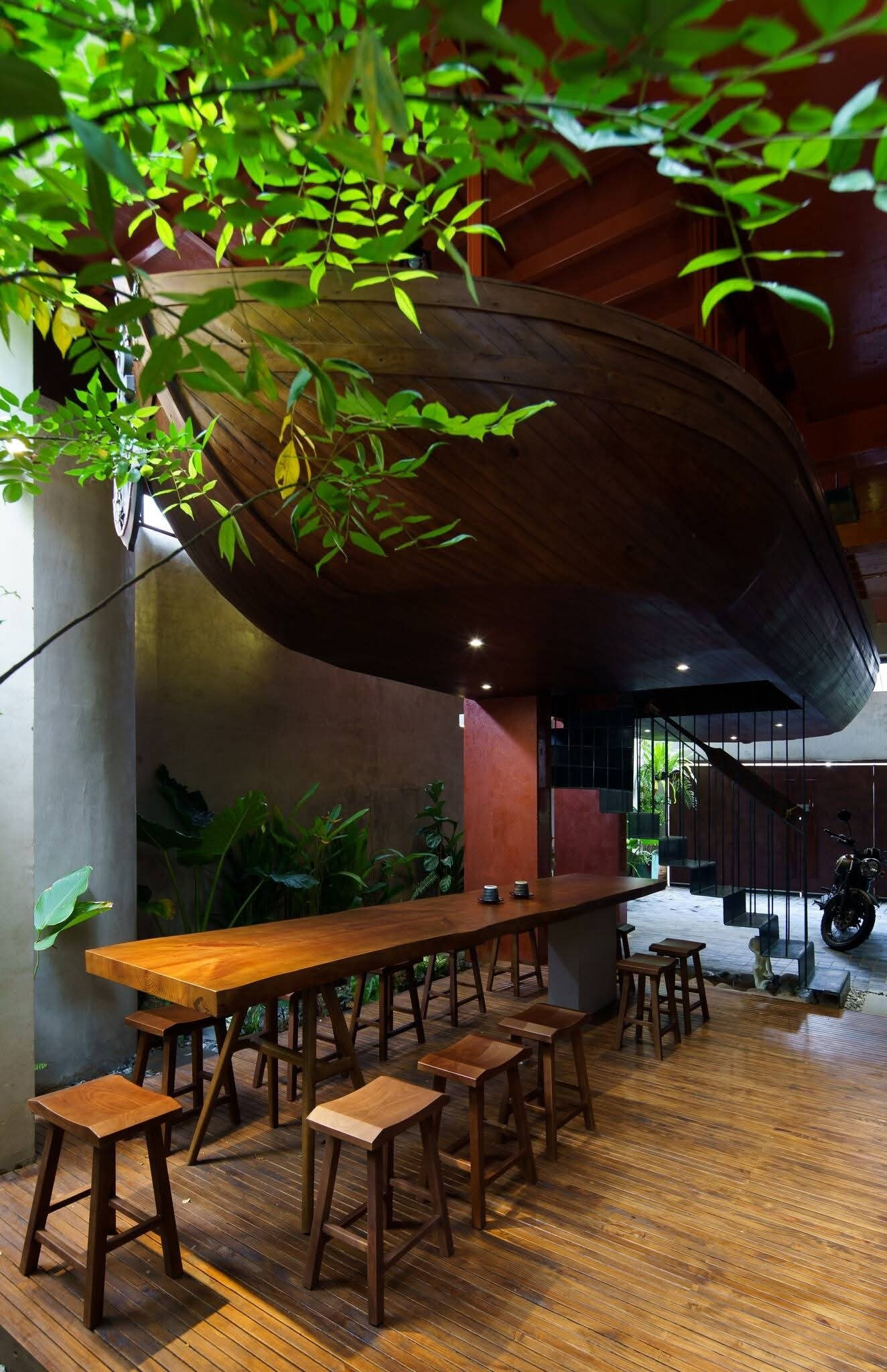 Công trình gây ấn tượng với chi tiết chiếc thuyền gỗ được đưa vào không gian nội thất như một điểm nhấn nghệ thuật độc đáo. Thiết kế mở kết hợp vật liệu mộc tạo nên cảm giác gần gũi biển cả, phản ánh cá tính và ký ức sống của gia chủ tại Vũng Tàu.