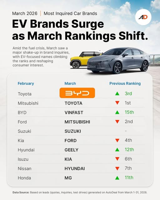 Theo dữ liệu từ AutoDeal, bảng xếp hạng các thương hiệu ô tô được quan tâm và chú ý nhiều nhất tại Philippines trong tháng 3/2026 đã có sự xáo trộn mạnh. Nếu như trong tháng 2, các vị trí dẫn đầu vẫn thuộc về những cái tên quen thuộc như Toyota, Mitsubishi hay Ford, thì sang tháng 3, các hãng xe điện bắt đầu chiếm ưu thế.