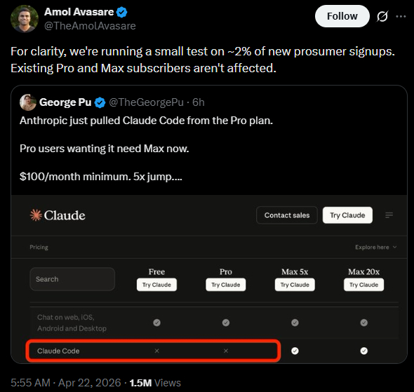 Để làm rõ, thì chúng tôi đang tiến hành thử nghiệm quy mô nhỏ trên 2% số người dùng mới đăng ký gói Pro. Những người dùng bản Pro và Max hiện tại đều không bị ảnh hưởng.