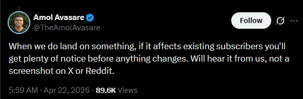 Dường như sức ảnh hưởng từ tấm ảnh “loan tin” kia quá khủng khiếp, khiến một lượng lớn người dùng Claude Pro bất an, Avasare đã phải tiếp tục đăng đàn trấn an người đăng ký gói Pro.