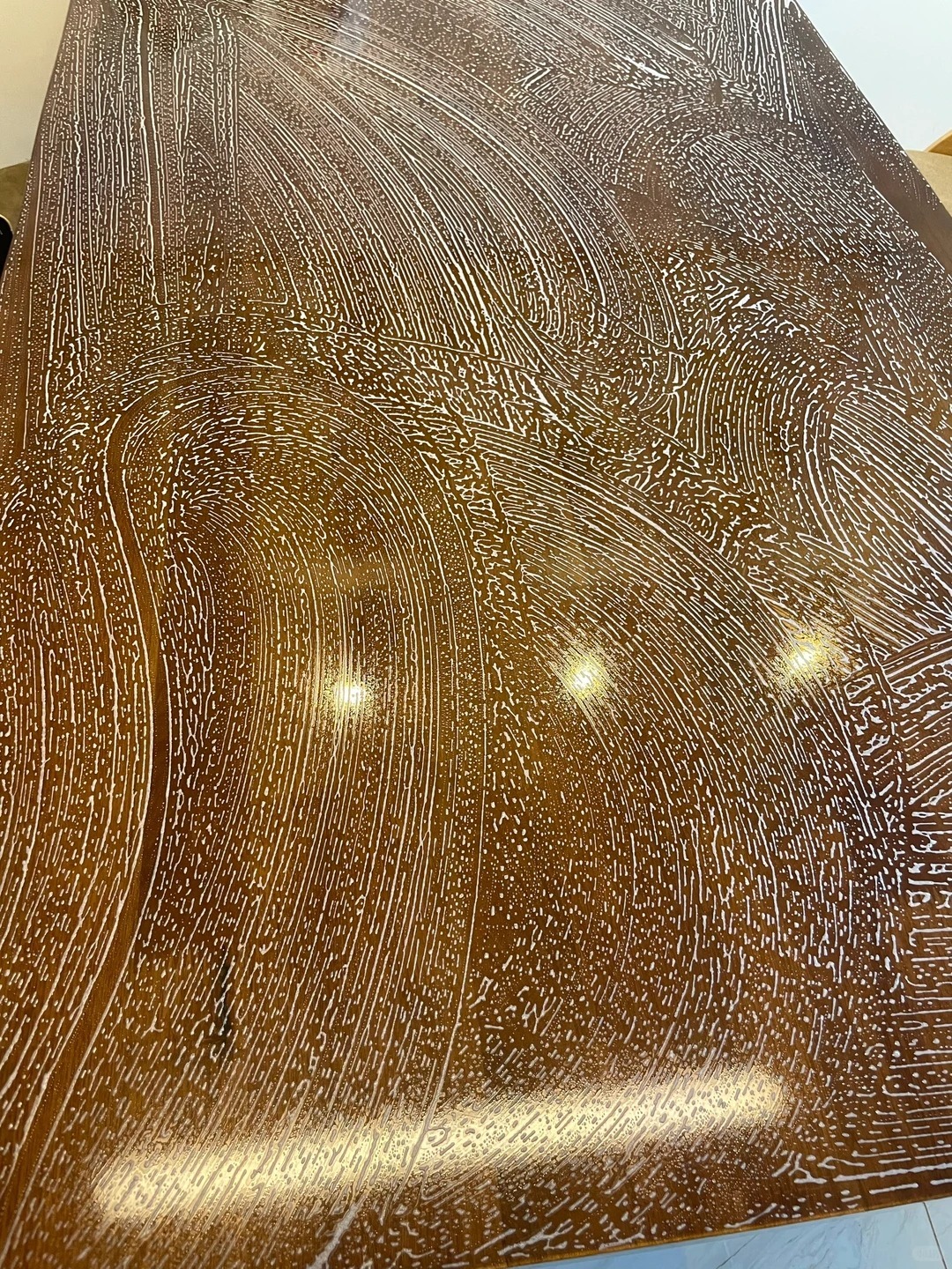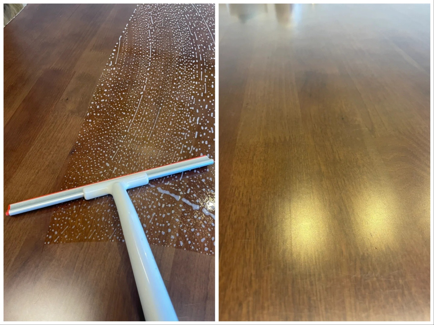 Bàn ăn là nơi ăn uống, học tập, làm việc nên cần sạch thật sự chứ không phải lau qua loa. Đầu tiên, bạn cần lau sạch vụn thức ăn khô. Sau đó xịt dung dịch gồm baking soda, nước rửa chén và nước lên mặt bàn, chà tạo bọt để xử lý dầu. Cuối cùng dùng cây gạt kính kéo sạch bọt và nước, lau lại bằng khăn ẩm. Kết quả là mặt bàn không dầu, không vệt nước, khô ráo ngay tức thì.
