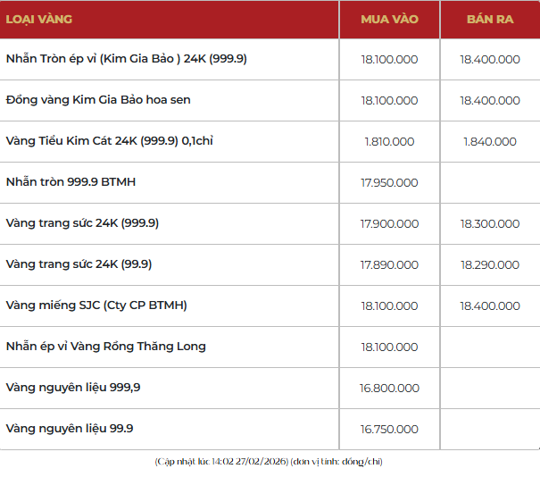 Cập nhật đầu giờ chiều nay (27/2), giá vàng tại các thương hiệu tương đối ổn định. Riêng Bảo Tín Minh Châu đồng thời giảm giá vàng nhẫn, vàng miếng 500 nghìn đồng/lượng, hiện giao dịch tại ngưỡng 180,5 - 183,5 triệu đồng/lượng (mua vào - bán ra).