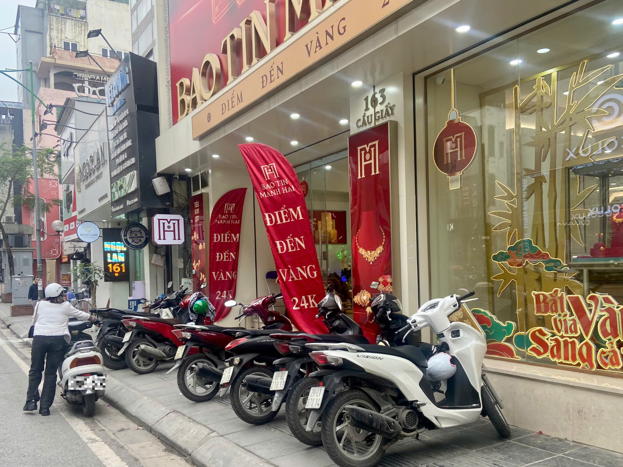 Nhìn chung, tình cảnh vắng vẻ tại các tiệm vàng trên phố Cầu Giấy đều khiến nhiều người bất ngờ. Cùng thời điểm này, cửa hàng Bảo Tín Mạnh Hải số 163 Cầu Giấy cũng tương tự. Vỉa hè - vốn trước đây là nơi kê ghế cho khách xếp hàng, hôm nay được “trưng dụng” làm chỗ để xe. Bên trong cửa hàng có khoảng 3-4 lượt khách đang giao dịch.