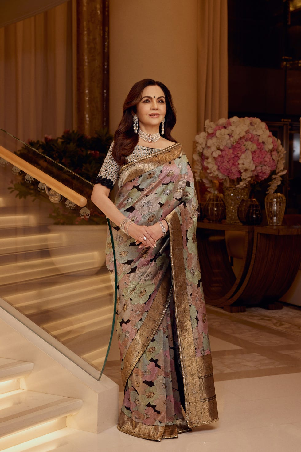 Không chỉ gây ấn tượng với trang sức, trang phục của bà Nita Ambani cũng mang giá trị đặc biệt. Tại đêm tiệc, bà diện một thiết kế sari lụa Banarasi được dệt thủ công tại thành phố Varanasi, nơi được mệnh danh là cái nôi của nghệ thuật dệt truyền thống Ấn Độ. Bộ trang phục mất khoảng 5 tháng để hoàn thiện, với họa tiết hoa anh túc được cách điệu theo phong cách hiện đại, sử dụng bảng màu pastel nhẹ nhàng.