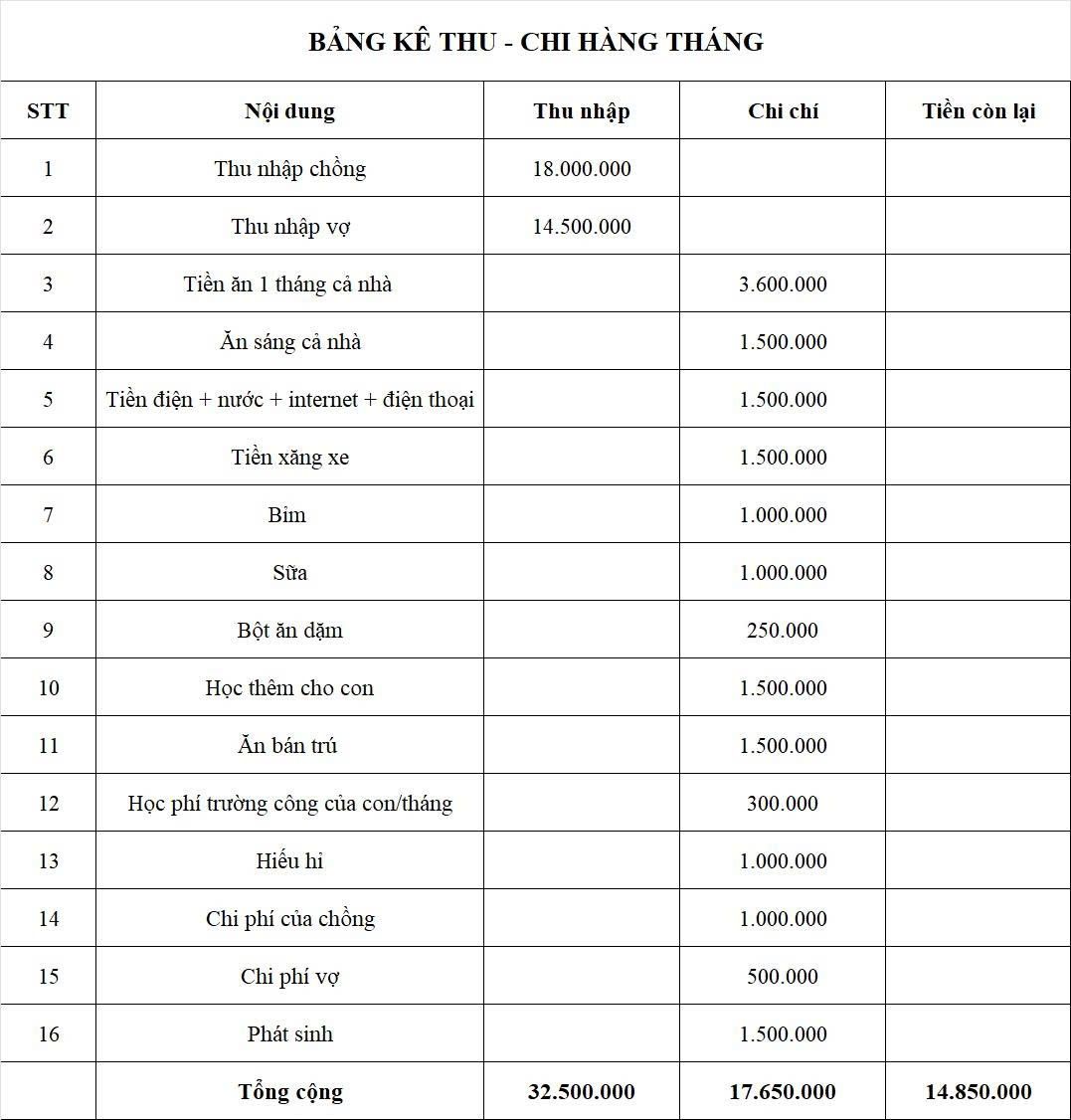 Với mức thu nhập 32,5 triệu/tháng, cô vẫn tiết kiệm được 14,85 triệu đồng dù đang nuôi 3 con. Điều này đồng nghĩa với tổng chi tiêu của cả gia đình 5 người chưa tới 18 triệu.