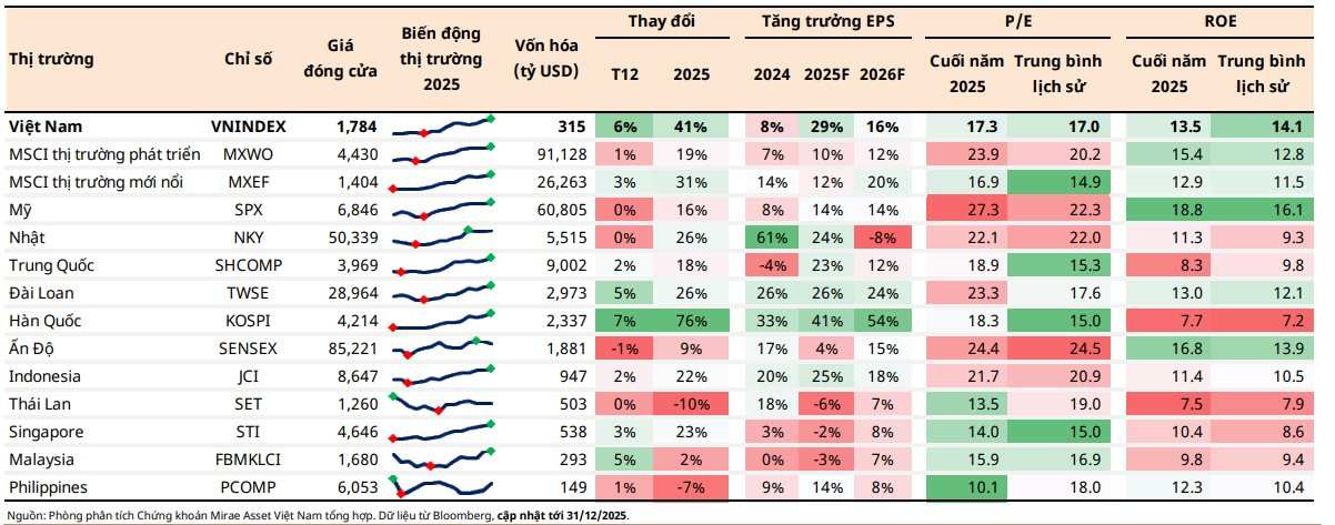 Về định giá thị trường, Mirae Asset đánh giá chứng khoán Việt Nam vẫn đang ở mức hấp dẫn so với tiềm năng tăng trưởng trung hạn. So với các thị trường trong khu vực, Việt Nam duy trì tỷ suất sinh lời trên vốn chủ sở hữu (ROE) cao cùng triển vọng tăng trưởng tích cực. Với kịch bản cơ sở dự báo tăng trưởng EPS khoảng 20%, VN-Index có thể hướng tới mốc 2.300 điểm, tương ứng mức P/E trung bình dài hạn khoảng 17 lần. Mức EPS dự phóng hiện tại phản ánh sự “bình thường hóa” sau giai đoạn tăng trưởng cao của năm 2025, khi lợi nhuận toàn thị trường tăng khoảng 30–33%.