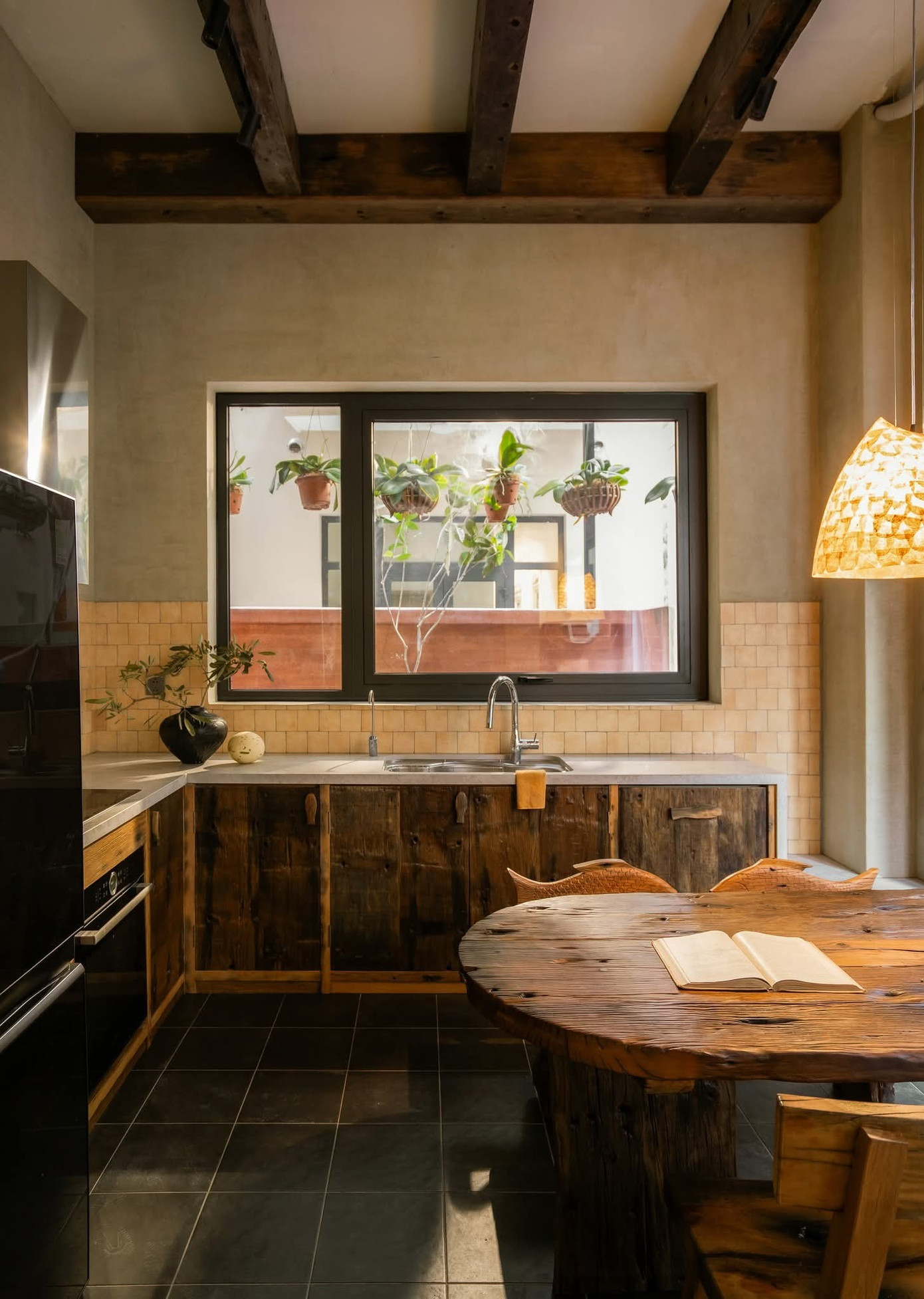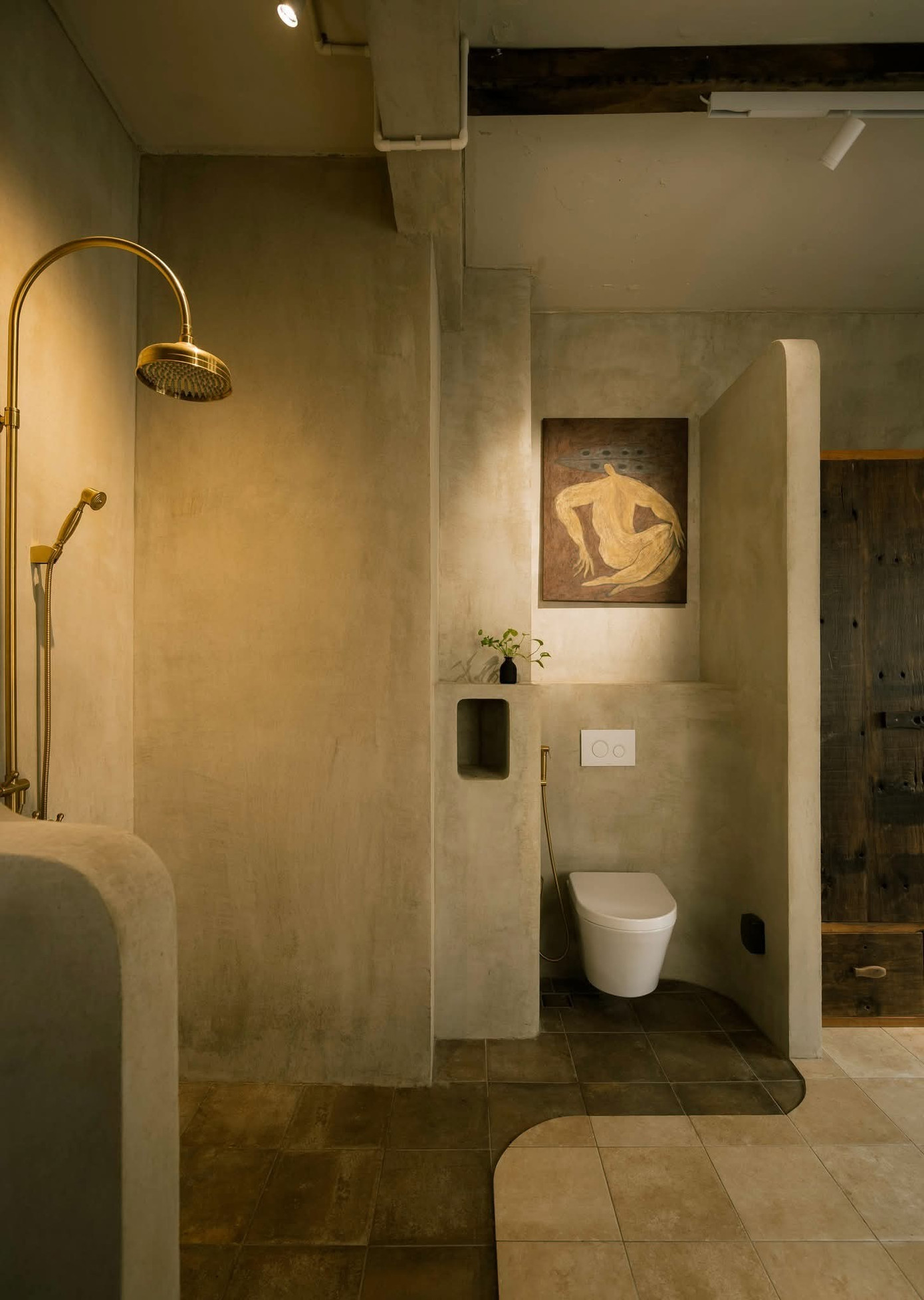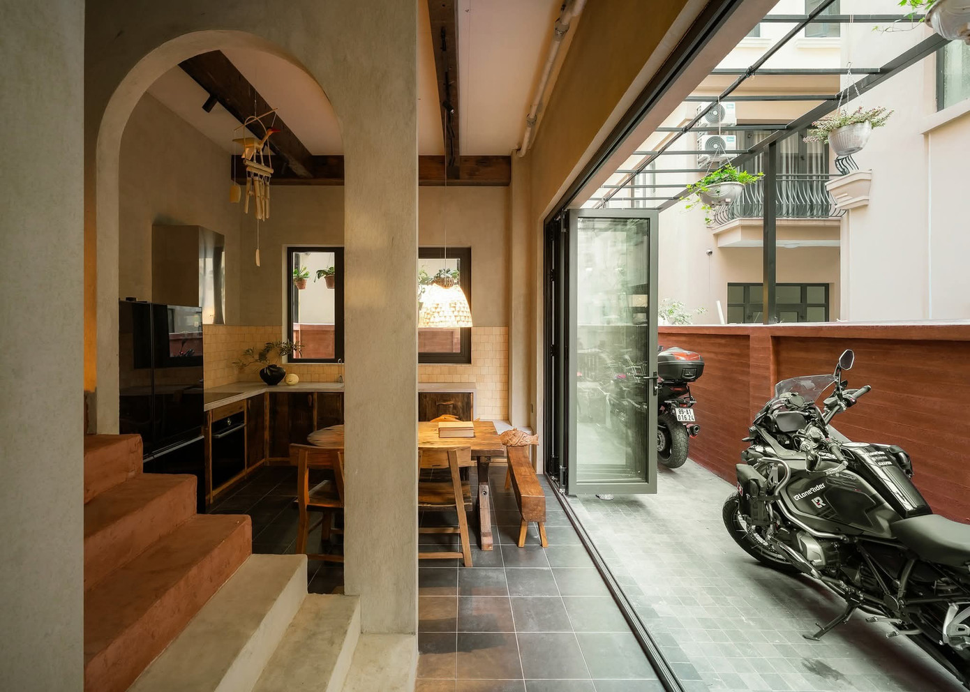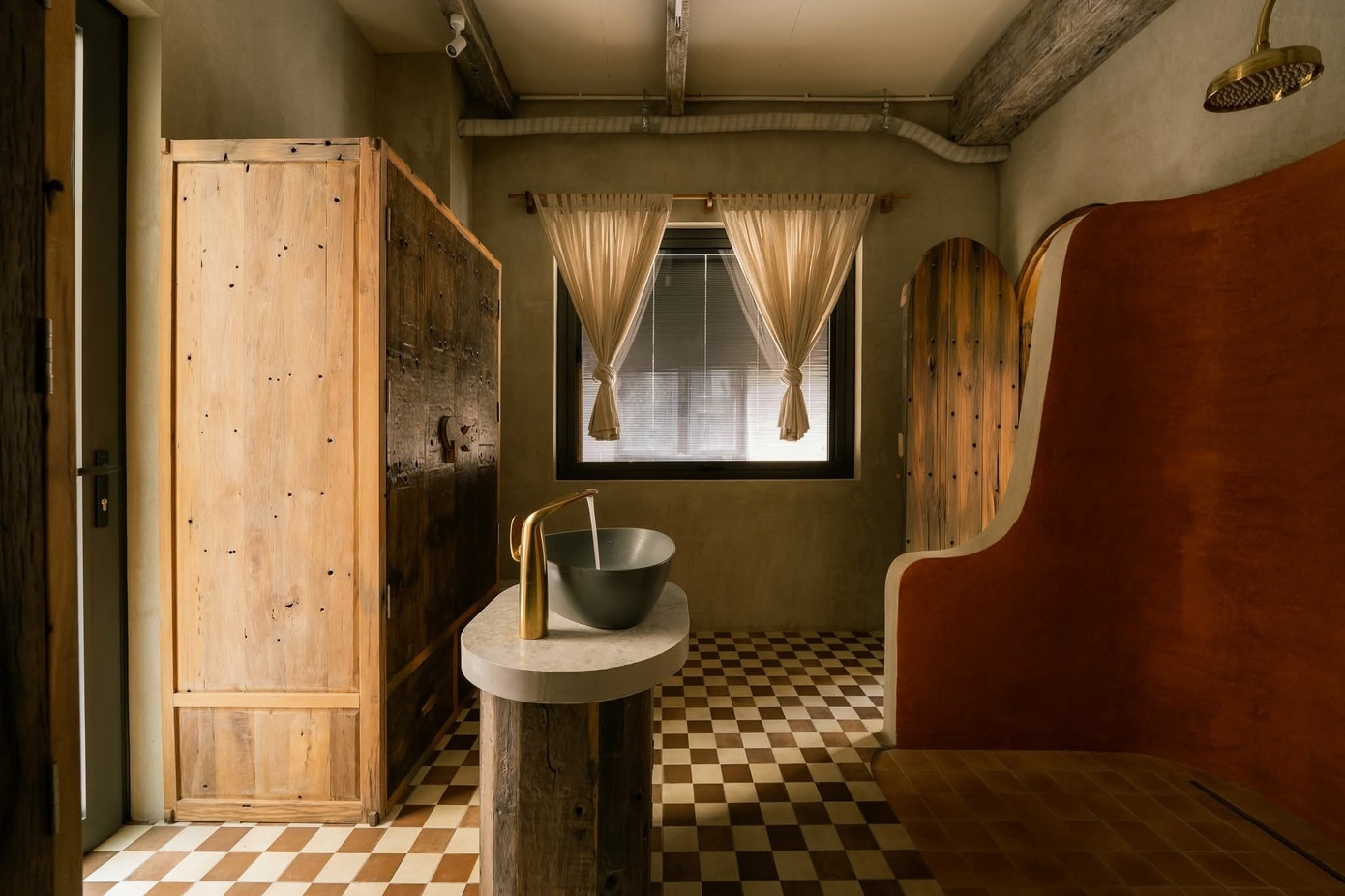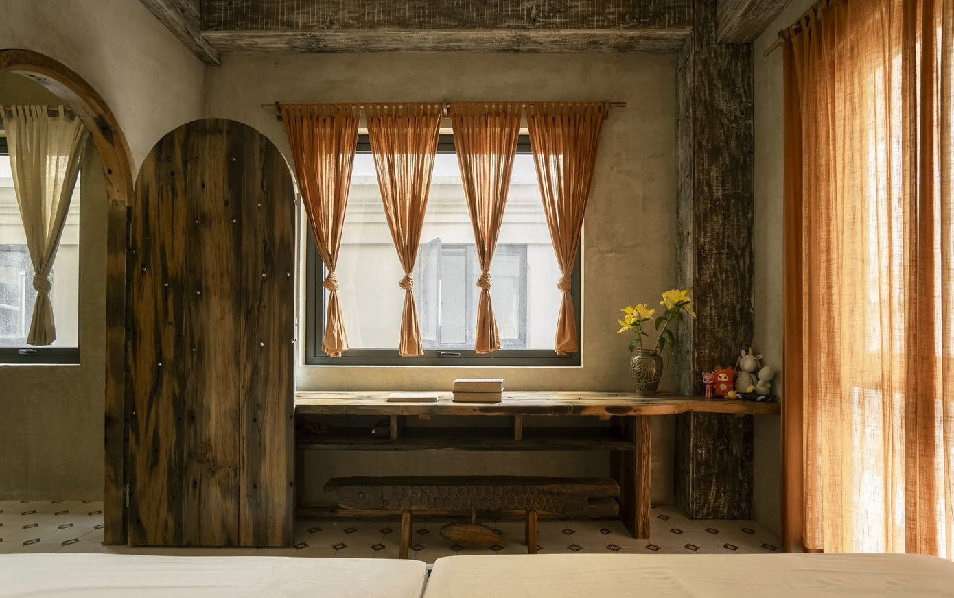 Tinh thần thô mộc không chỉ được thể hiện qua nội thất gỗ mà còn hiện diện qua tường hiệu ứng, vật liệu gạch, đá, đường nét bất đối xứng, bất toàn khắp mọi ngóc ngách.