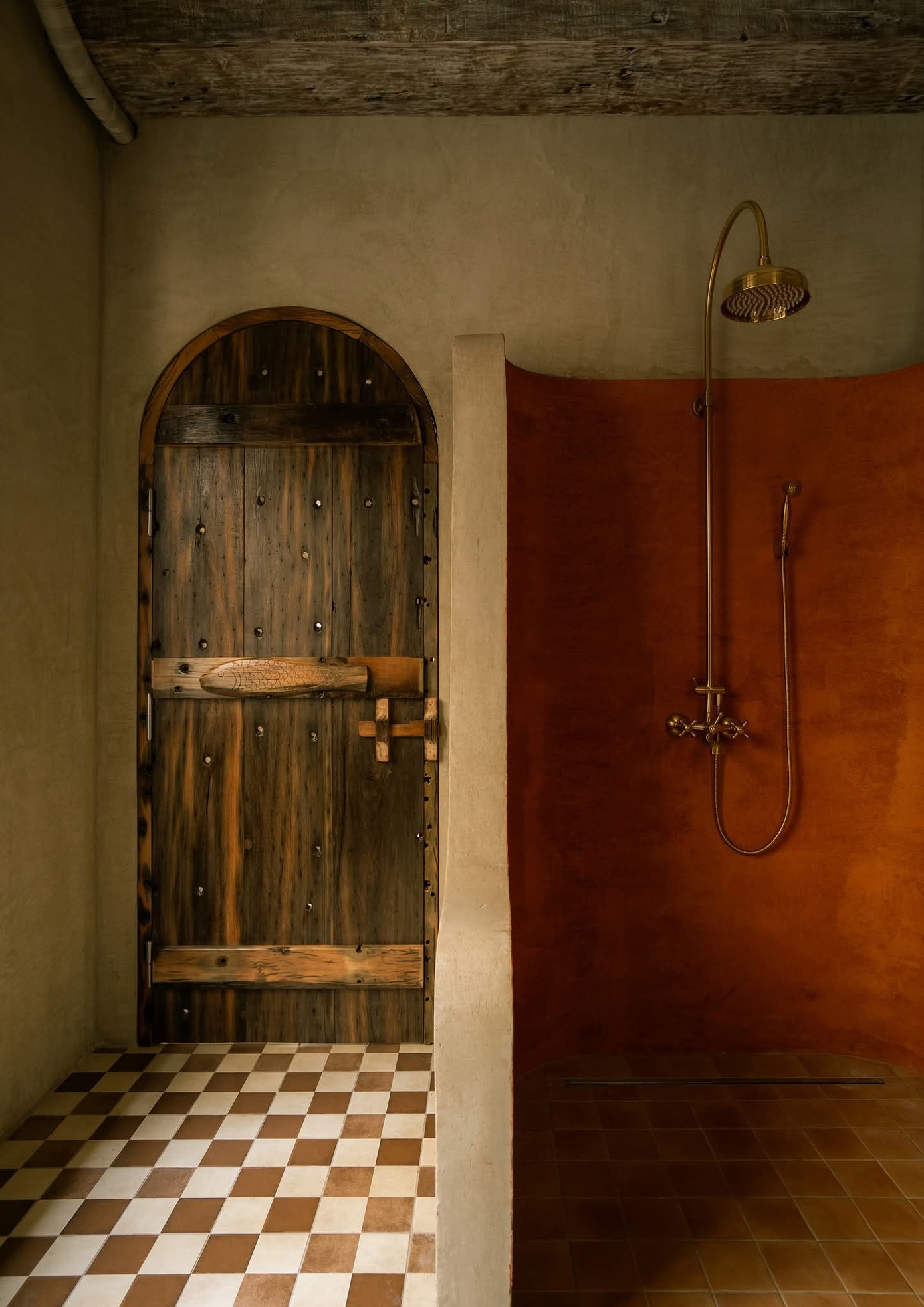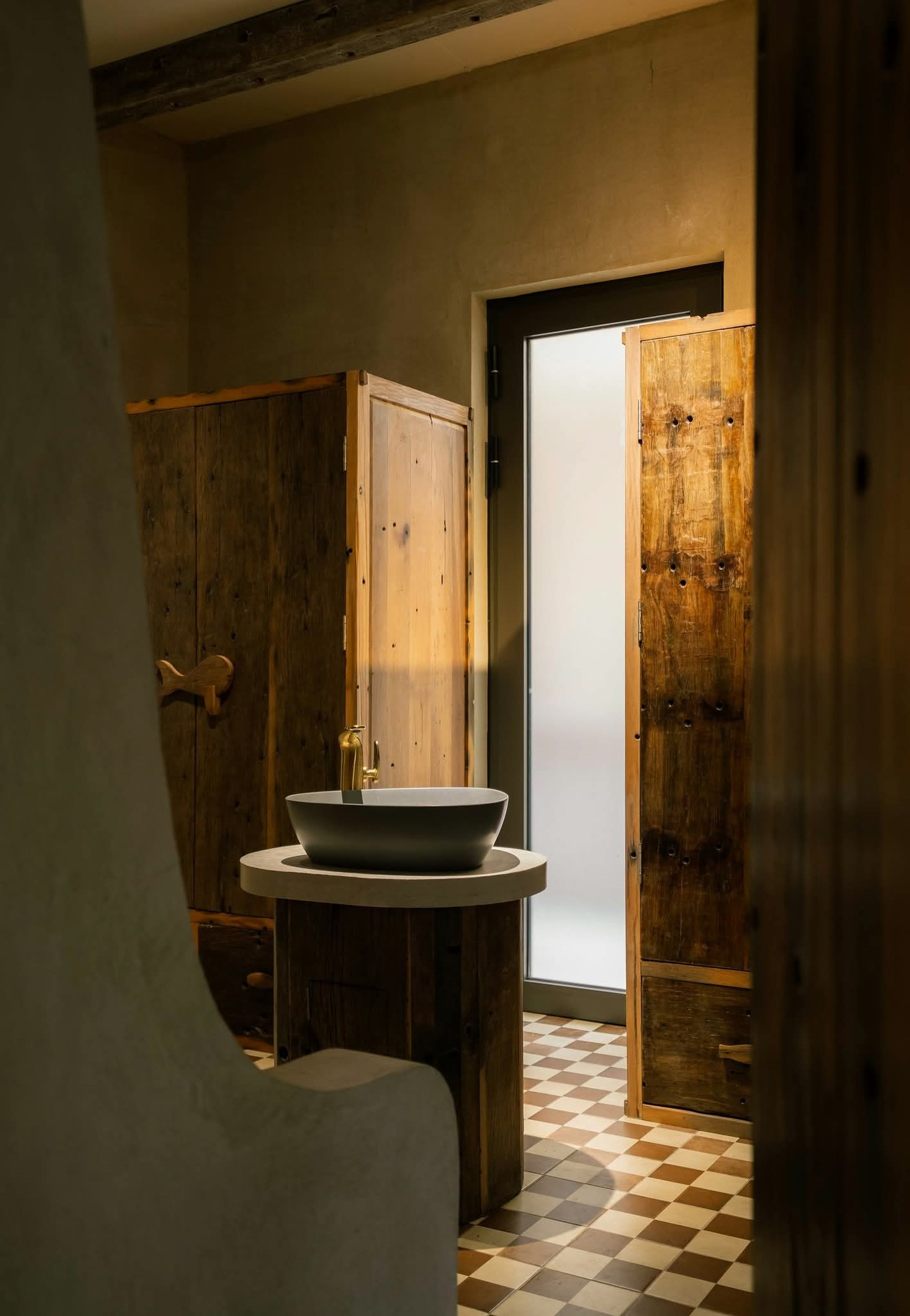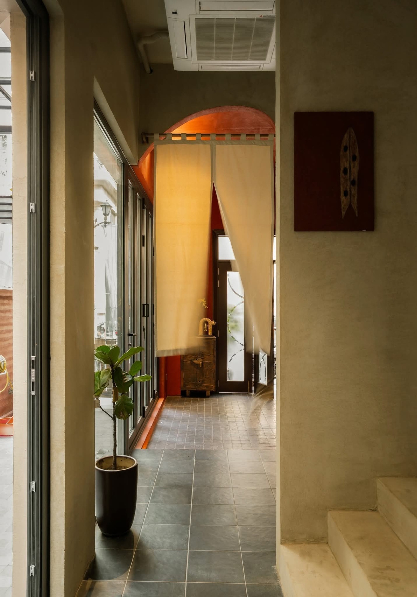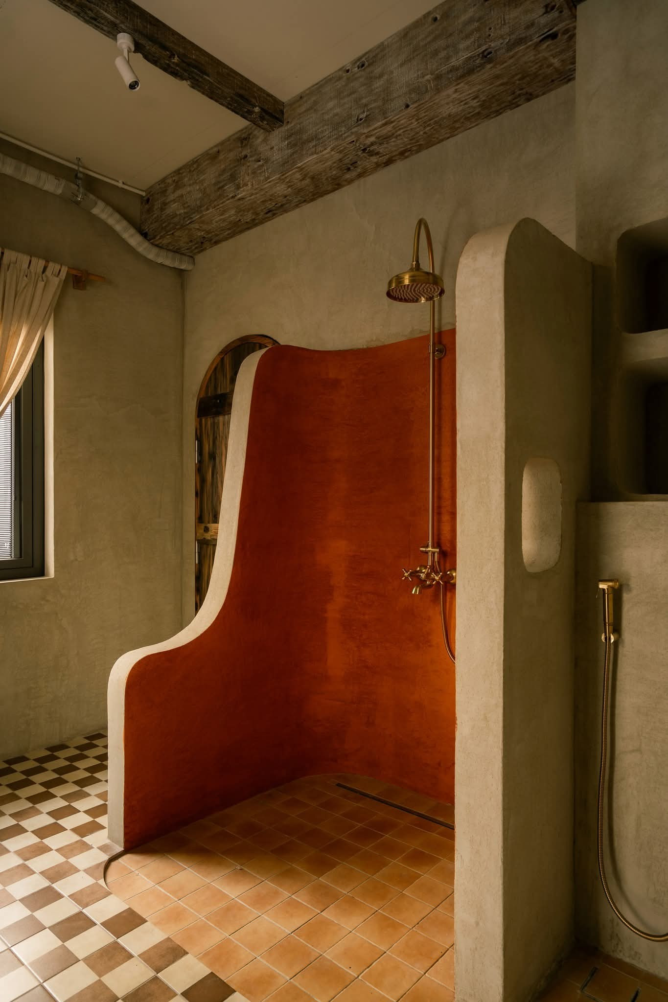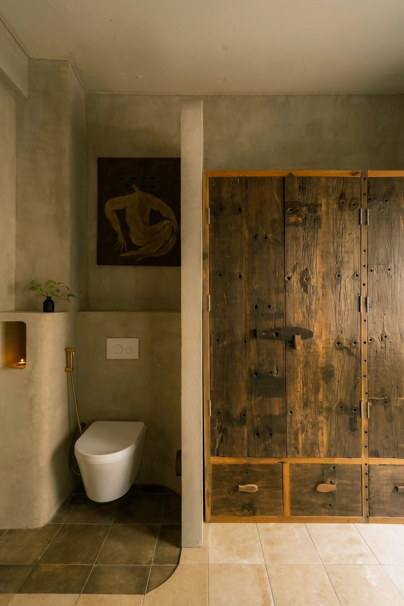 Tinh thần thô mộc không chỉ được thể hiện qua nội thất gỗ mà còn hiện diện qua tường hiệu ứng, vật liệu gạch, đá, đường nét bất đối xứng, bất toàn khắp mọi ngóc ngách.