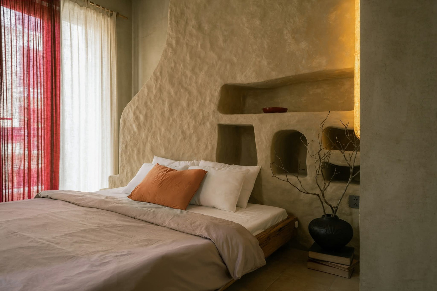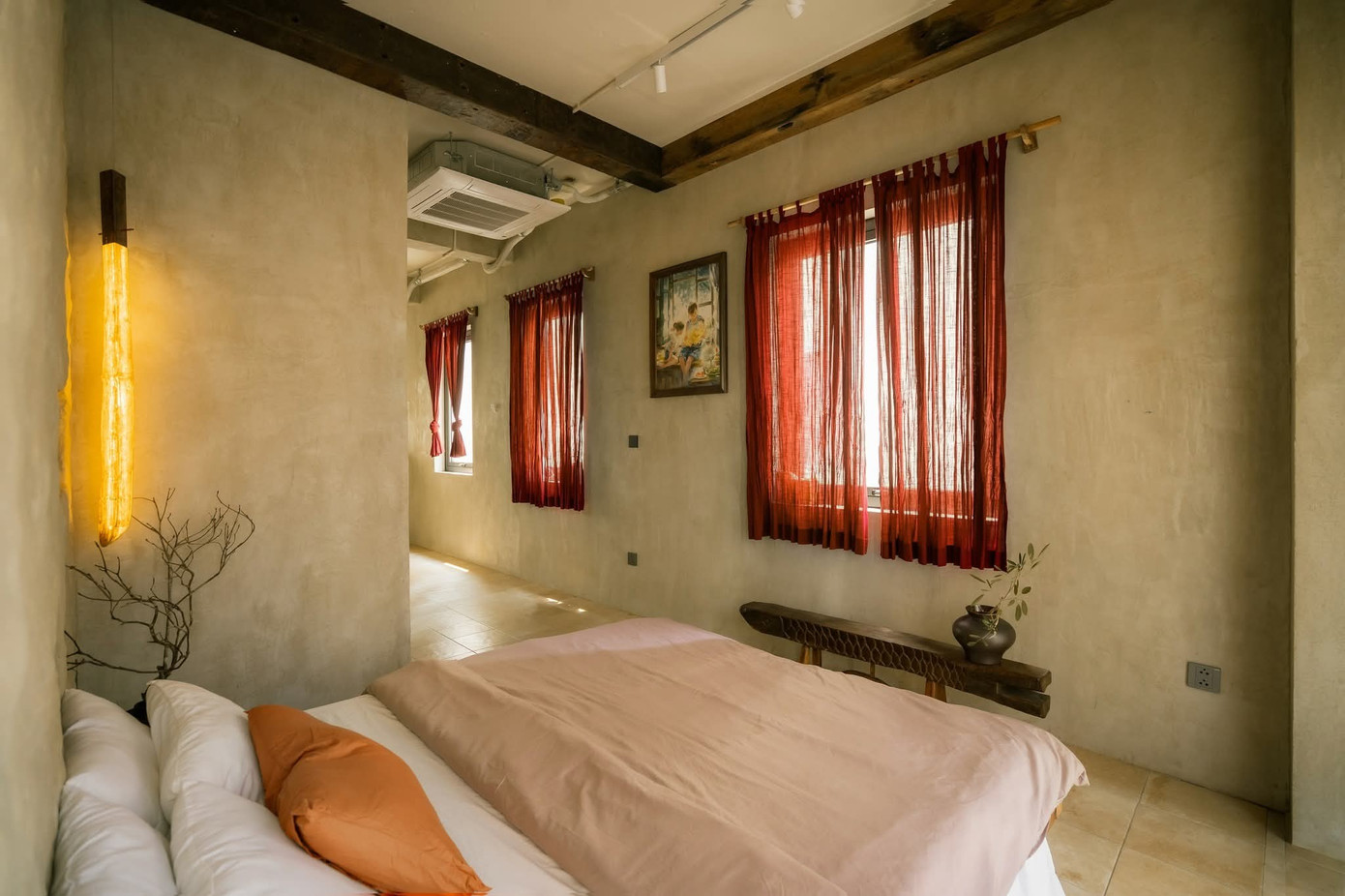 Không gian với tính cách thô mộc và những mảng màu mạnh cá tính. Nội thất gỗ Táu tái sinh từ thuyền cũ và đầy ắp đồ thủ công, vải lanh, đèn giấy,... biến nơi này thành một "hang động" đầy cảm hứng.