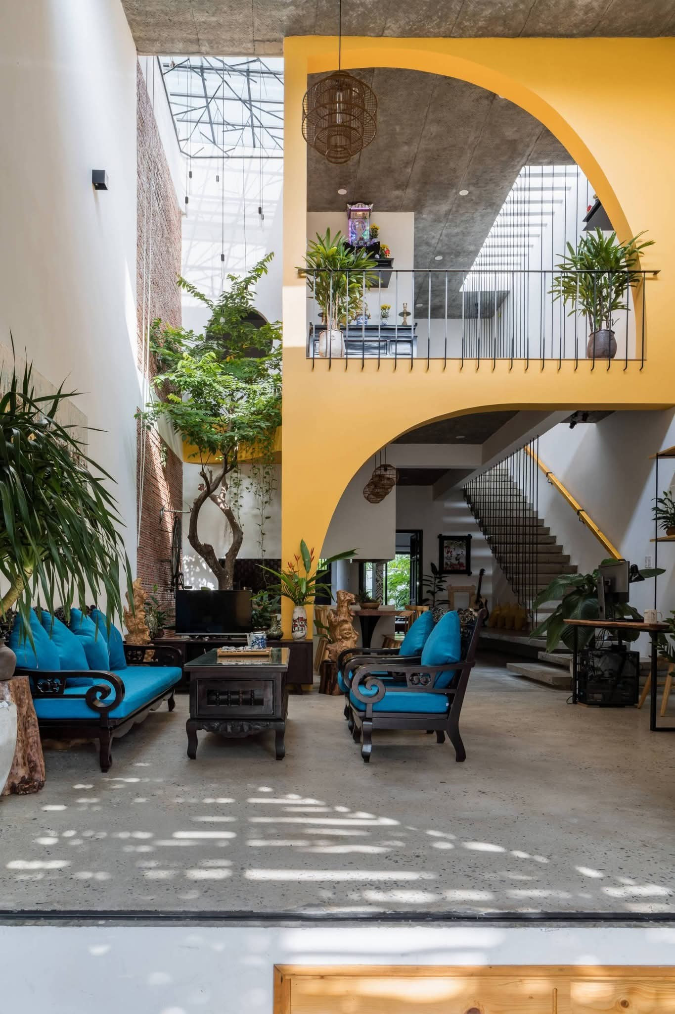 Không gian mở với giếng trời và khoảng thông tầng khiến ánh sáng tự nhiên và gió trời len lỏi khắp nơi, tạo nên sự tươi mới và thoáng đãng mỗi ngày. Sân hiên lát gạch đỏ cùng cây xanh mang lại cảm giác bình yên, khiến ai bước vào cũng như chạm vào một phần ký ức thân thuộc.