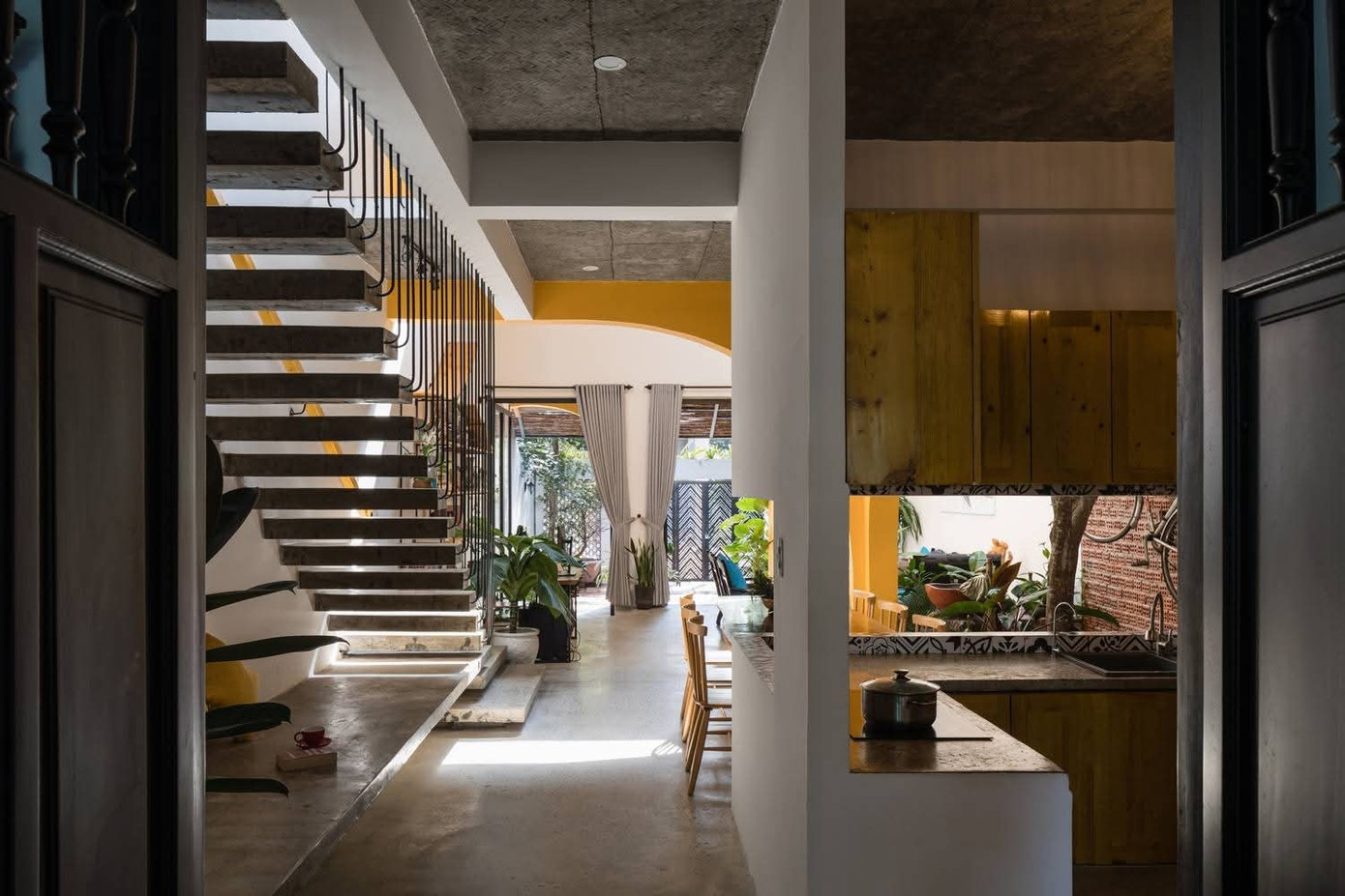 Không gian mở với giếng trời và khoảng thông tầng khiến ánh sáng tự nhiên và gió trời len lỏi khắp nơi, tạo nên sự tươi mới và thoáng đãng mỗi ngày.