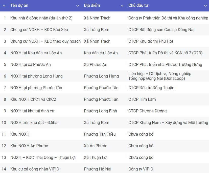 Một số dự án tiêu biểu có thể kể đến như khu nhà ở công nhân tại Nhơn Trạch do Công ty Nhà IDICO (IDC) làm chủ đầu tư; các dự án chung cư NOXH tại Bàu Xéo, Lộc An, Phú Hội; cùng chuỗi dự án NOXH tại Phước Tân và Long Hưng do các doanh nghiệp như Him Lam, Donacoop và D2D thực hiện.