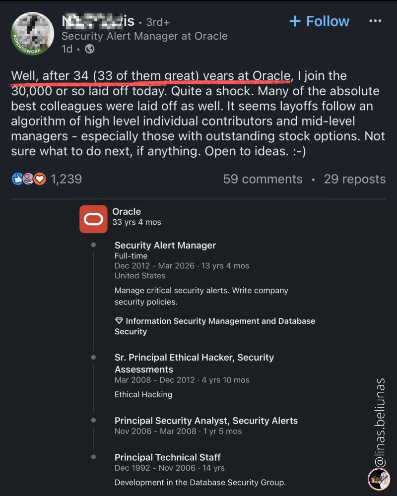 Trên LinkedIn, bà Lewis viết: "Sau 34 năm (33 năm trong đó thật tuyệt vời) ở Oracle, tôi là một trong 30.000 người bị sa thải hôm nay. Thật sốc. Nhiều đồng nghiệp giỏi nhất cũng bay việc." Nhưng điều đáng chú ý nhất không phải là việc bà bị sa thải, mà là lý do bà nghi ngờ đằng sau chuyện này.