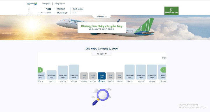Bamboo "cháy" vé máy bay chuyến Vinh - TP.HCM mùng 6 Tết 2026. (Ảnh chụp màn hình)