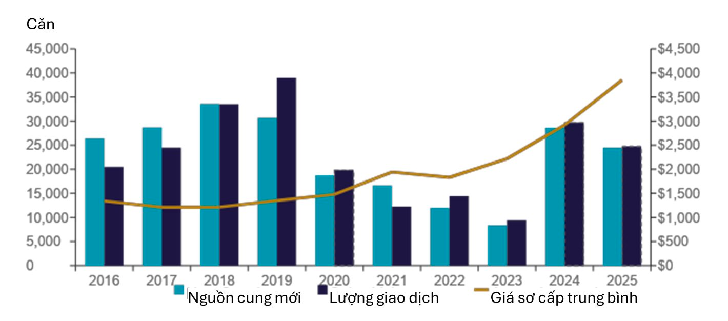 Trong 10 năm qua, thị trường căn hộ Hà Nội đã ghi nhận mức tăng trưởng đáng kể, với tổng nguồn cung tăng 2,9 lần và giá sơ cấp trung bình tăng 288%, tương đương tốc độ tăng trưởng kép hàng năm (CAGR) 11%. Theo Cushman & Wakefield Việt Nam, đà tăng bền bỉ của giá sơ cấp trong giai đoạn này một phần đến từ sự thiếu hụt nguồn cung nhà ở có mức giá phải chăng.