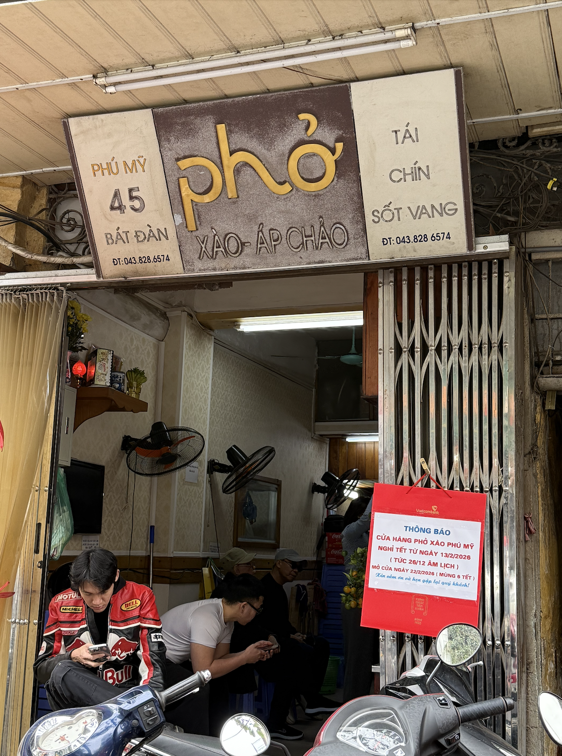 Với những ai mê món phở xào, Phở xào Phú Mỹ (Bát Đàn) cũng có lịch nghỉ khá dài: từ 13/2 (26/12 âm lịch) đến 22/2 (mùng 6 âm lịch), tức 9 ngày.