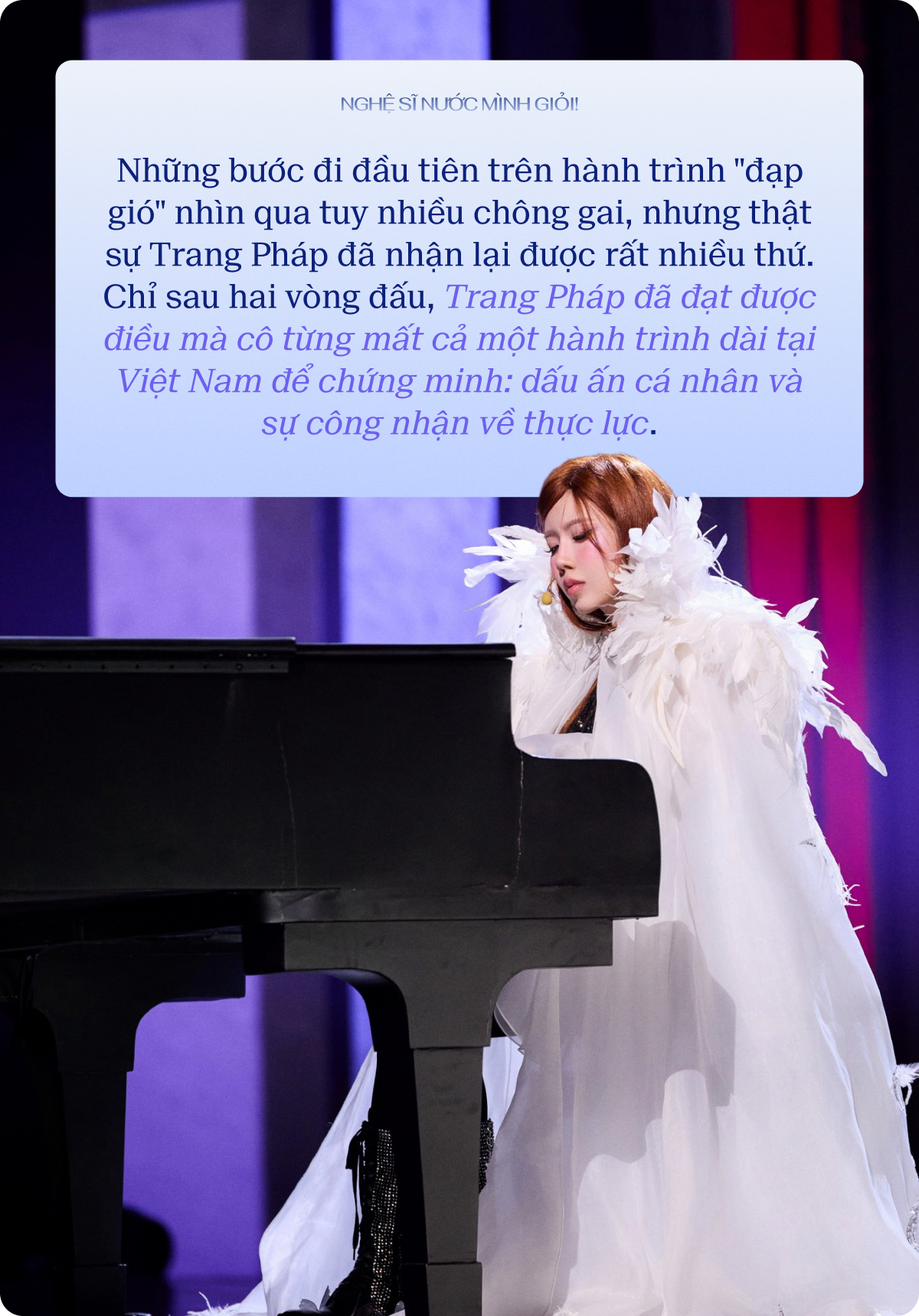 Hành trình dẫu có chông gai, những kết quả dẫu có lúc chưa thực sự phản ánh hết nỗ lực, nhưng dấu ấn cá nhân mà Trang Pháp để lại tại sân chơi quốc tế này là không thể phủ nhận. Cô đang viết nên một câu chuyện truyền cảm hứng mạnh mẽ, minh chứng cho việc nghệ sĩ nước mình giờ đây đã hoàn toàn đủ lông đủ cánh, đủ bản lĩnh để dùng thực lực và cái tôi nghệ thuật khiến khán giả quốc tế phải gật đầu nể phục. Họ không cần phải vay mượn hào quang của ai, không cần dựa vào những ồn ào truyền thông để thu hút sự chú ý. Chỉ bằng chính thực lực vốn có và một lòng tự hào dân tộc sâu sắc, Trang Pháp đã và đang làm rạng danh hình ảnh nghệ sĩ người Việt Nam trong mắt bạn bè quốc tế.
