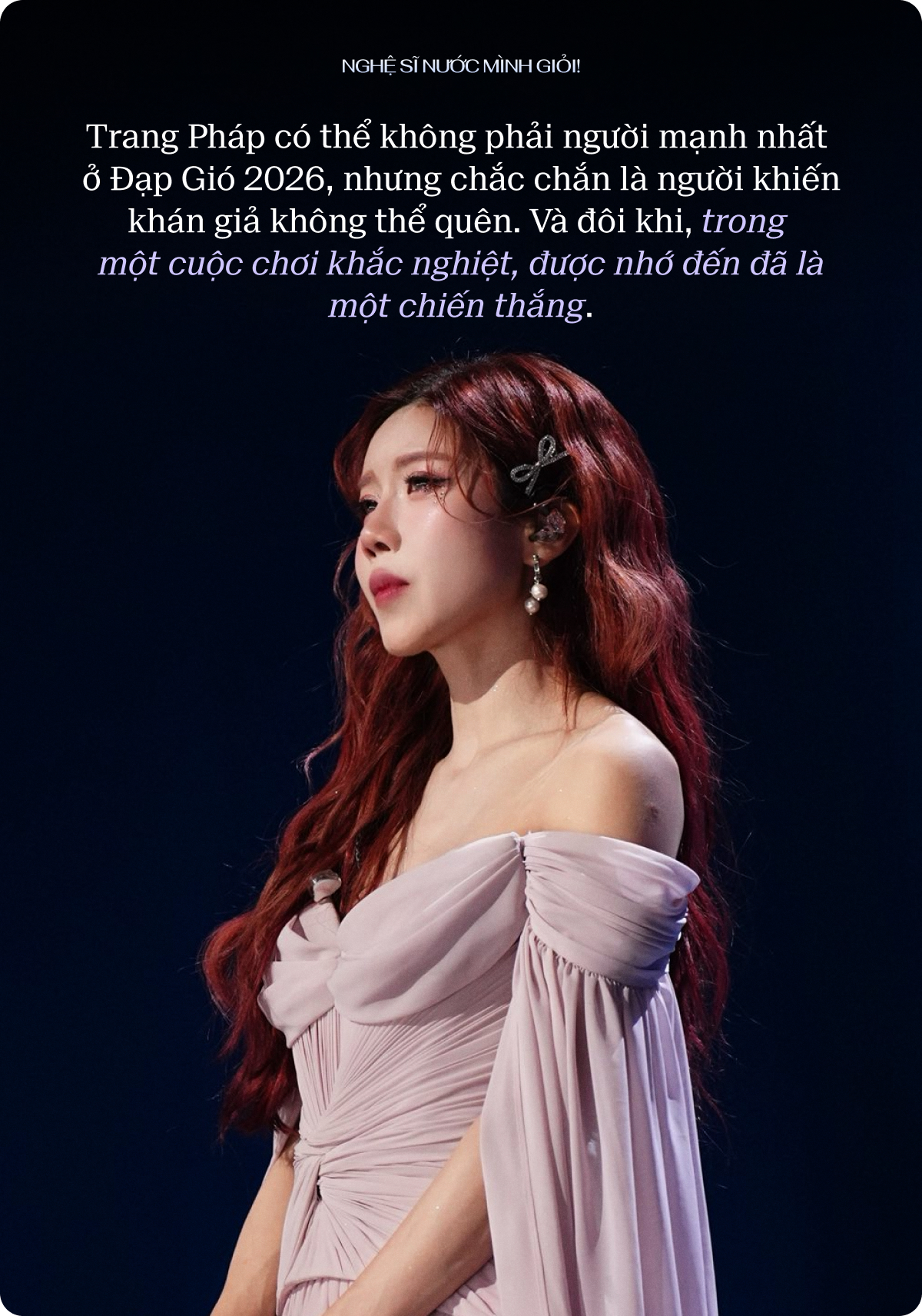 Hai vòng thi đấu đầu tiên khép lại với kết quả chưa như kỳ vọng. Nhưng nếu nhìn vào cách cái tên Trang Pháp phủ sóng mạng xã hội Trung Quốc, có thể thấy rõ một điều rằng cô không hề “thua”. Trang Pháp đến với Đạp Gió 2026 không chỉ để giành lấy vị trí số một. Mục tiêu của cô lớn lao hơn thế. Trang Pháp thành công khắc sâu hình ảnh cá nhân và mang hình ảnh người nghệ sĩ Việt Nam tỏa sáng rực rỡ trước một tệp khán giả hoàn toàn mới.