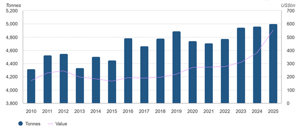 Tính chung, tổng nhu cầu vàng trong năm 2025, bao gồm cả giao dịch phi tập trung (OTC), lần đầu tiên đạt 5.000 tấn. Điều đó, cộng thêm giá vàng tăng mạnh trong năm qua đã tạo ra giá trị chưa từng có là 555 tỷ USD, tăng tới 45% so với năm trước.