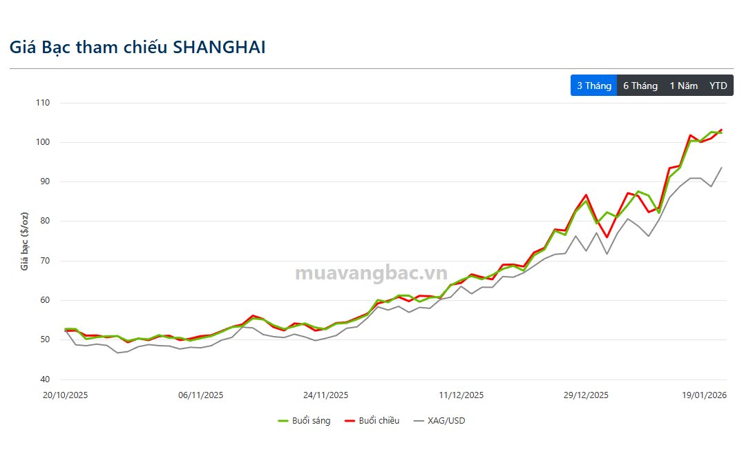 Đáng chú ý, giá bạc vật chất tại Thượng Hải thậm chí đã vọt lên mức 103,2 USD/oz trong phiên chiều 19/1. Như vậy, mức chênh lệch giữa giá bạc vật chất tại Thượng Hải so với giá bạc trên COMEX (Mỹ) lên tới gần 10 USD/oz.