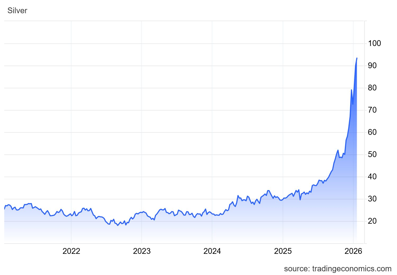 Chiều ngày 19/1, trên thị trường quốc tế, giá bạc trên COMEX (Mỹ) giao dịch quanh vùng đỉnh 93,3 - 93,5 USD/oz, tăng hơn 3,3 USD/ounce, tương đương tăng 3,8% so với lúc mở cửa.