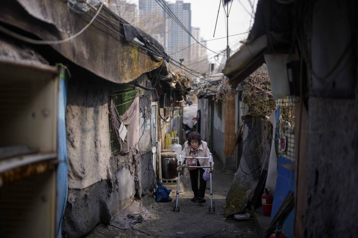 Vào một ngày tháng 3 gần đây, bà Lee lần theo một con hẻm hẹp đến mức người đi phải xếp hàng một, cúi đầu tránh mái tôn rách và những dây điện chằng chịt buông thõng từ các căn lều thấp hai bên. Dựa vào khung tập đi, bà chậm rãi tiến về căn nhà không cửa sổ của mình, nơi chỉ có thể ra vào qua một lối nhỏ chật chội rộng vài bước chân, đồng thời cũng là khu bếp và chỗ sinh hoạt cá nhân.