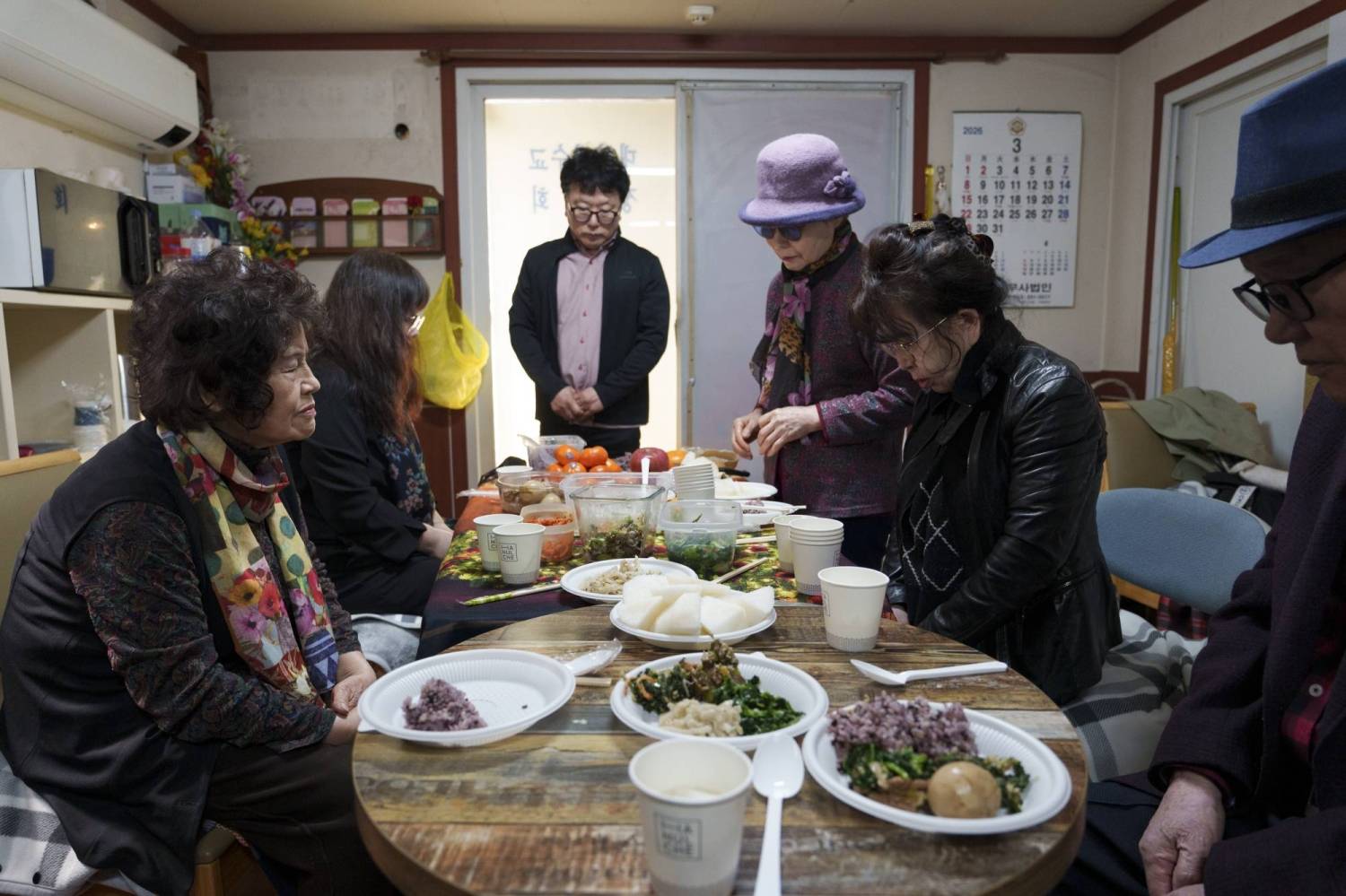 Bà Lee Chang-wol (bên trái) đang cầu nguyện trước khi dùng bữa tại một nhà thờ trong khu ổ chuột làng Guryong, quận Gangnam, Seoul vào ngày 22 tháng 3 (Ảnh: Chang W. Lee / The New York Times)