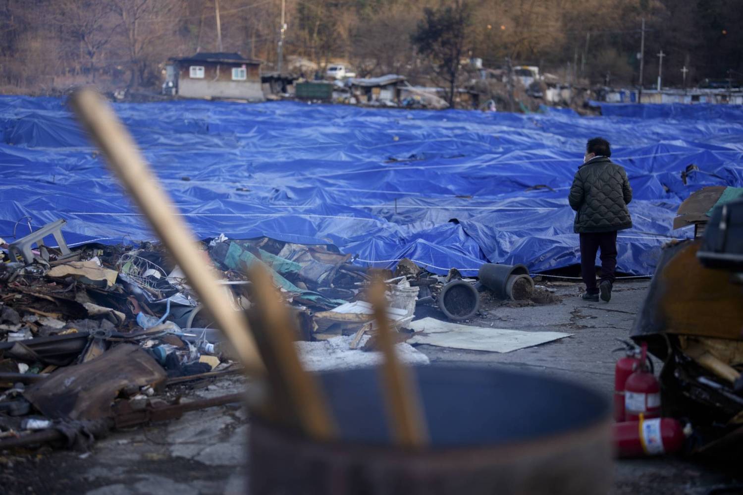 Bà Ko Jae-ok nhìn tấm bạt xanh che phủ khu vực xảy ra vụ hỏa hoạn hồi tháng 1 đã thiêu rụi nhiều ngôi nhà, trong đó có cả nhà của bà, tại khu ổ chuột làng Guryong (Ảnh: Chang W. Lee/The New York Times)