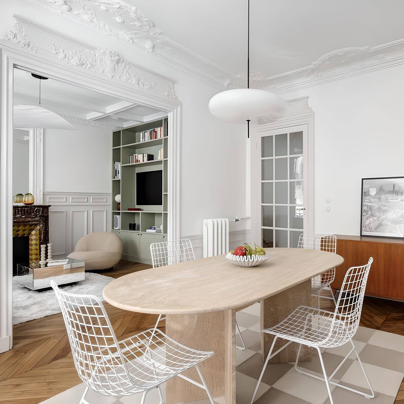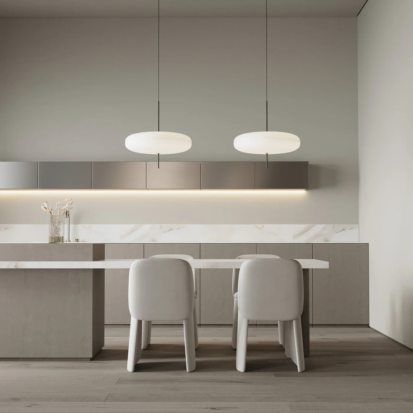 Chất liệu thủy tinh mờ, kim loại mờ hoặc ánh sáng vàng ấm giúp khu vực bàn ăn trở nên mềm mại, giảm sự khô cứng của các vật liệu bếp. Đặc biệt, trong không gian bếp – khách liên thông, đèn cụm còn đóng vai trò phân tách chức năng tinh tế mà không cần đến tường hay vách ngăn, giữ cho tổng thể căn hộ luôn thông thoáng và liền mạch.