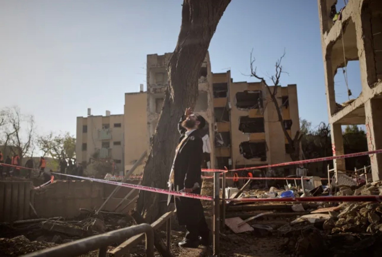 Một người đàn ông đứng trên đống đổ nát của khu nhà trúng tên lửa Iran ở miền nam Israel ngày 22/3. (Ảnh: AP)