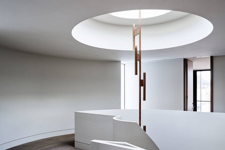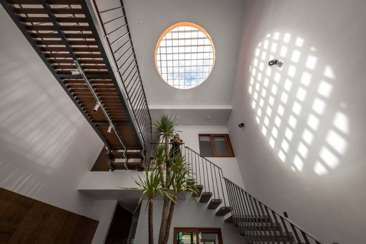 Giếng trời đặt ở giữa nhà kết hợp cầu thang xoắn là sự kết hợp độc đáo, giúp ánh sáng tự nhiên chiếu thẳng xuống, tạo không gian nghệ thuật đầy ấn tượng.