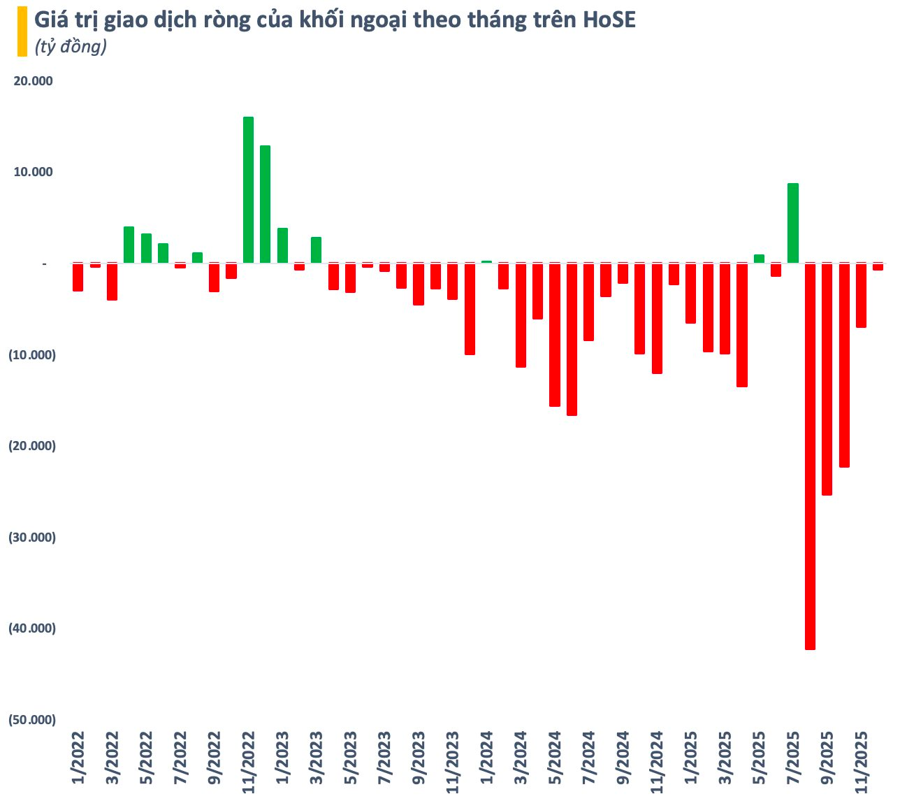 Hơn 128.000 tỷ đồng (4,8 tỷ USD) là giá trị bán ròng của khối ngoại trên HoSE tính từ đầu năm 2025 đến nay. Con số này thậm chí còn vượt xa mức kỷ lục ghi nhận trong năm 2024. Tuy nhiên, điểm tích cực là áp lực bán đang có dấu hiệu hạ nhiệt so với cao điểm giai đoạn tháng 8-9-10. Giá trị bán ròng đã giảm mạnh trong tháng 11 và còn gần như không đáng kể tính từ đầu tháng 12.