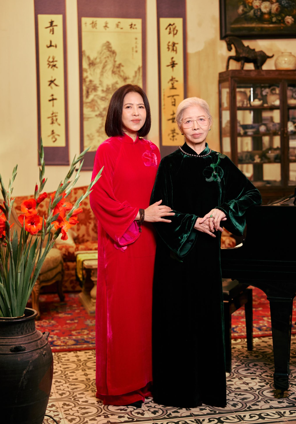 Bên cạnh thiết kế, chất liệu là yếu tố góp phần định hình phong cách của các mẫu áo dài và đầm. Sự kết hợp giữa nhung, lụa và organza mang lại cảm giác sang trọng vừa phải, phù hợp với không khí trang trọng nhưng ấm cúng của ngày Tết. Những chất liệu này cũng giúp trang phục có độ rủ và chuyển động mềm mại, tạo sự thoải mái cho người mặc trong các hoạt động gia đình.