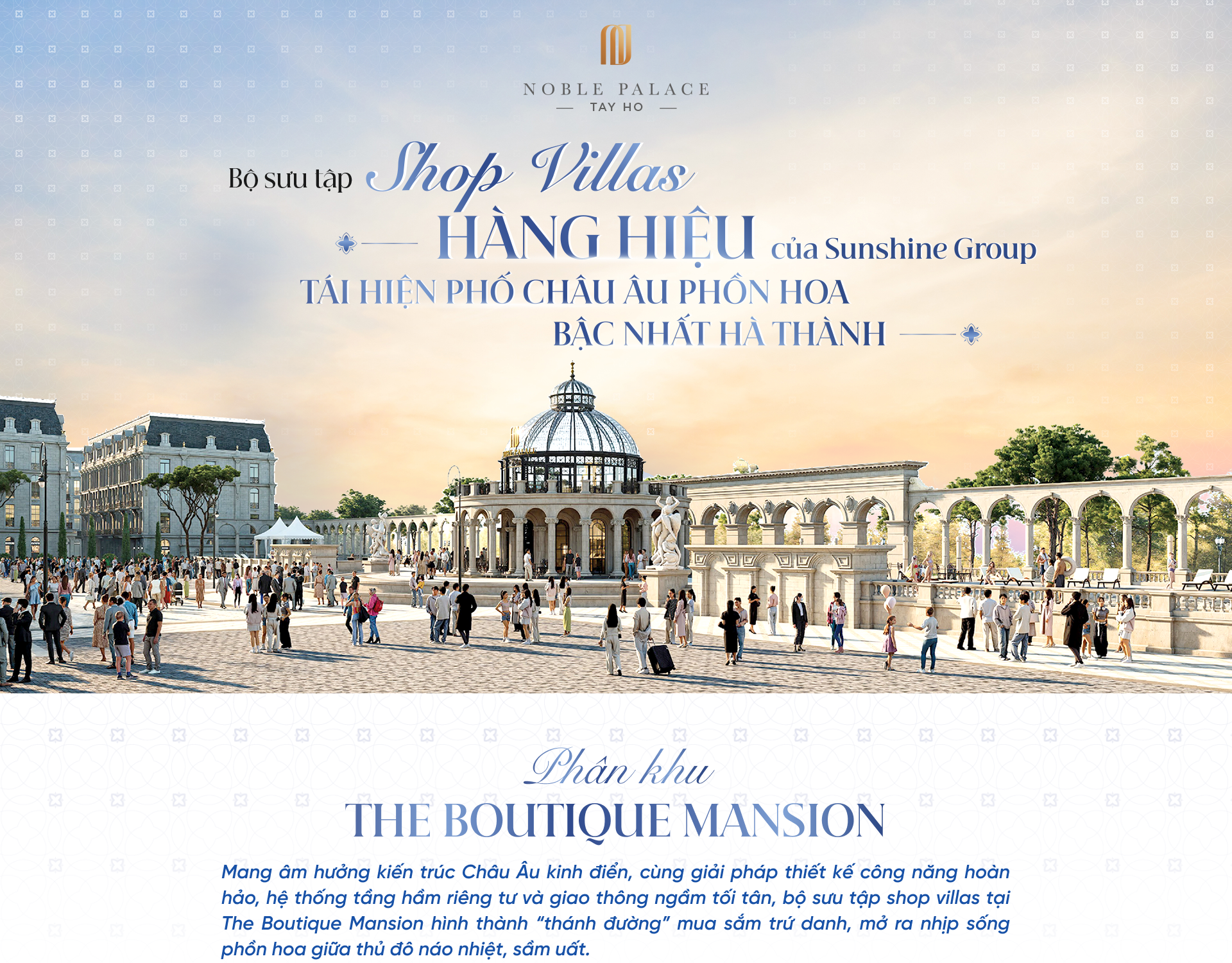 Hiện thực hóa giấc mơ ấy, Sunshine Group kiến tạo The Boutique Mansion - một phân khu thuộc dự án thấp tầng hàng hiệu Noble Palace Tay Ho. Lấy cảm hứng từ các đại lộ lừng danh châu Âu, nơi đây quy tụ những shop villas bề thế tái hiện những thánh đường mua sắm sầm uất, những lễ hội đa sắc màu hay trình diễn 3D Mapping bất tận. Và ở đó, mỗi sản phẩm là một giải pháp công năng hoàn hảo đáp ứng đa nhu cầu, tích hợp cùng hệ thống giao thông ngầm không khói và tầng hầm riêng tư đa năng, mang đến những đặc quyền sống, kinh doanh, đầu tư đích thực dành cho giới tinh hoa.