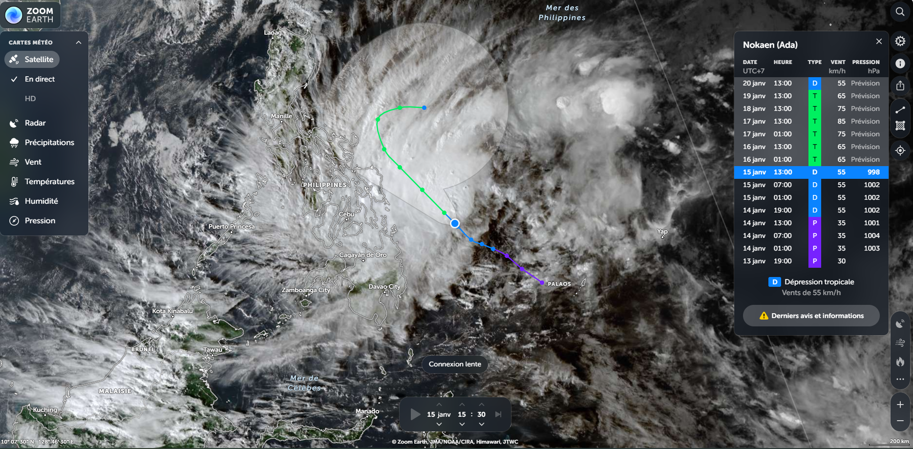 Diễn biến bão chiều 15/1 (Ảnh: Zoom Earth)