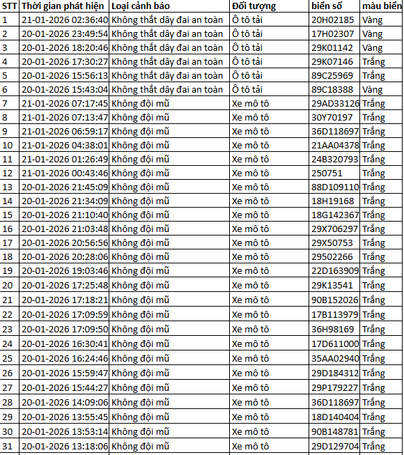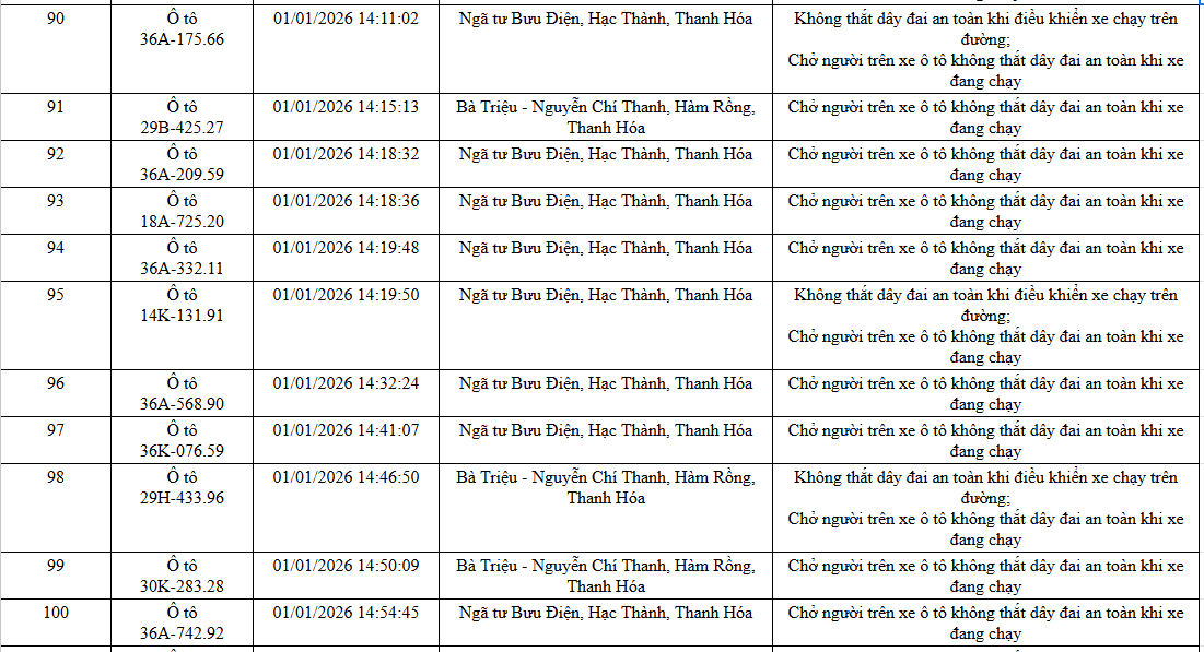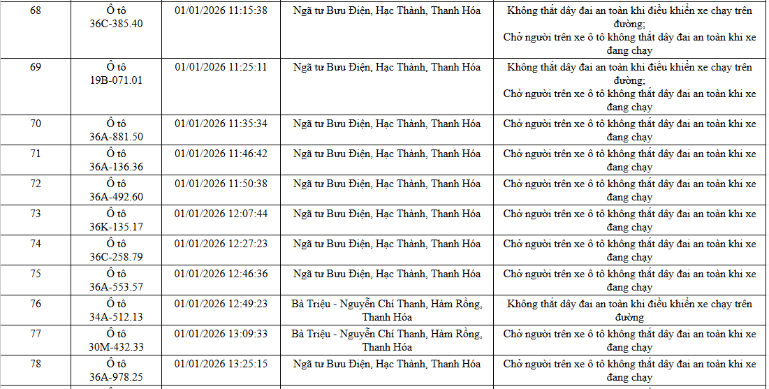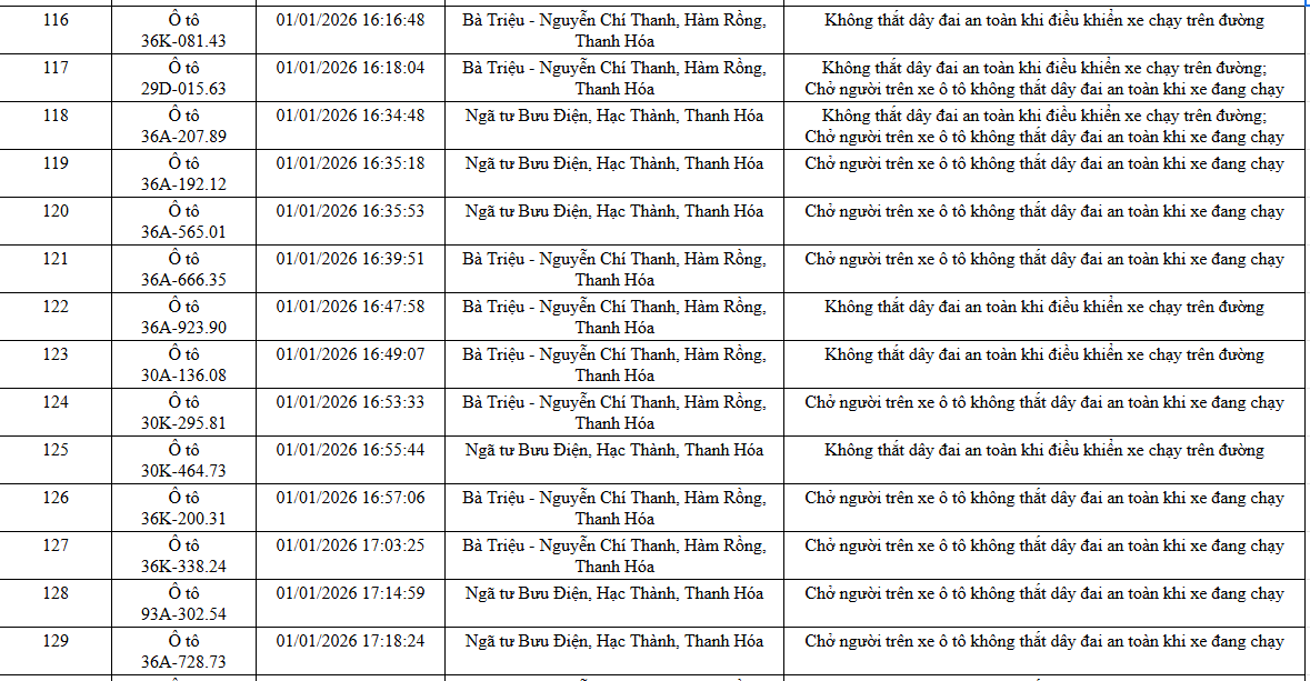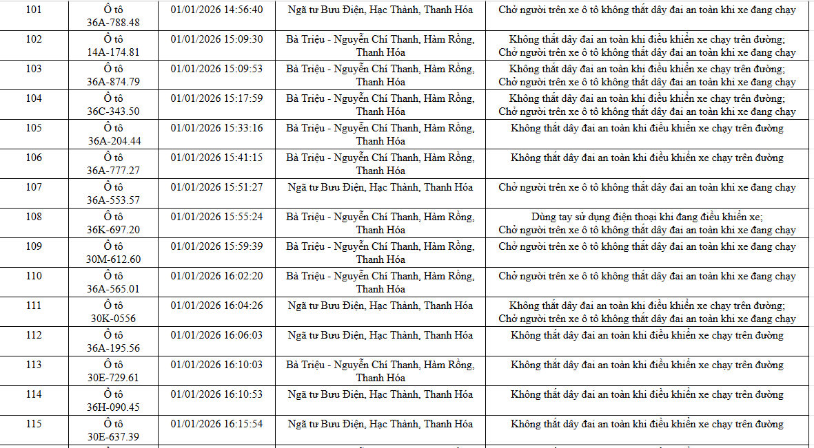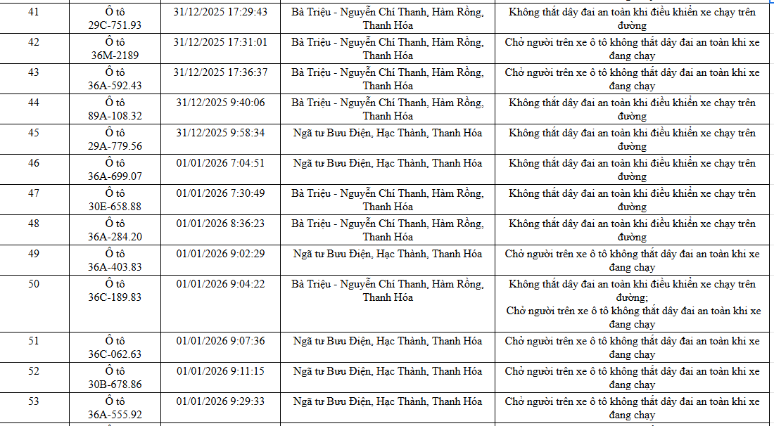 Ngày 20/1, Phòng Cảnh sát giao thông, Công an tỉnh Thanh Hoá thông báo các phương tiện vi phạm về TTATGT đường bộ được phát hiện qua Hệ thống camera giám sát an ninh, trật tự và an toàn giao thông trên địa bàn từ ngày 31/12/2025 đến ngày 02/1/2026.