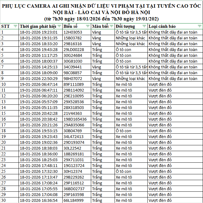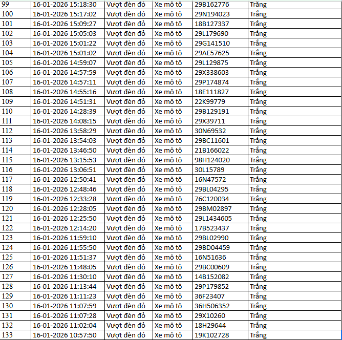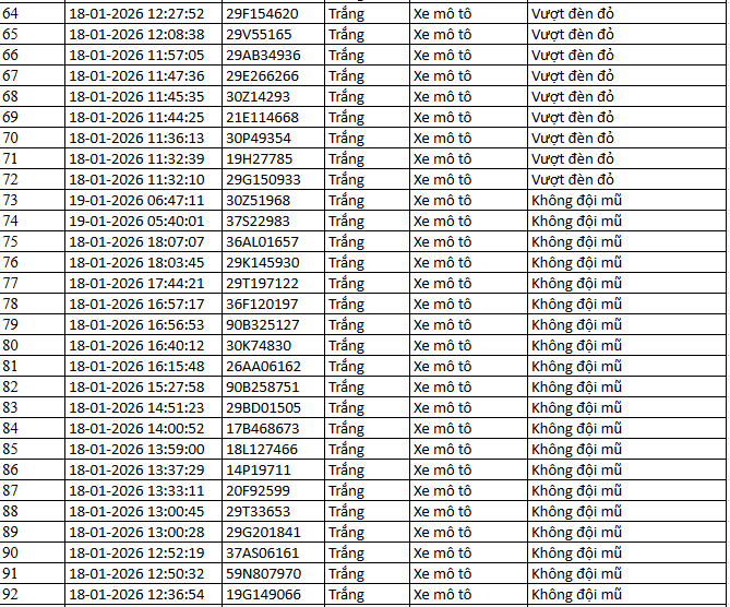Từ 12h00’ ngày 18/1/2026 đến 12h00’ ngày 19/1/2026, đã phát hiện 99 trường hợp xe ô tô, xe máy vi phạm.