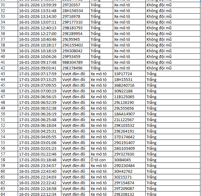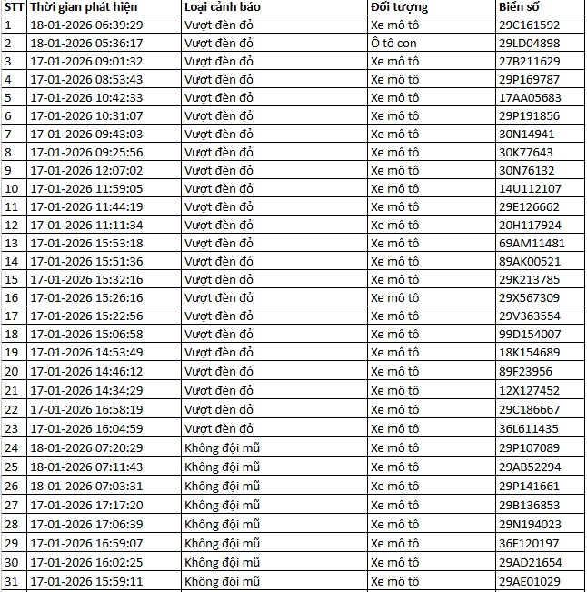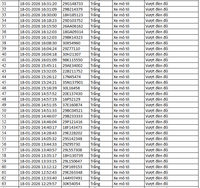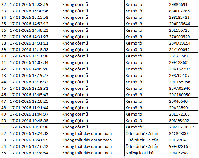 Từ 12h00’ ngày 17/1/2026 đến 12h00’ ngày 18/1/2026, đã phát hiện 55 trường hợp xe ô tô, xe máy vi phạm.