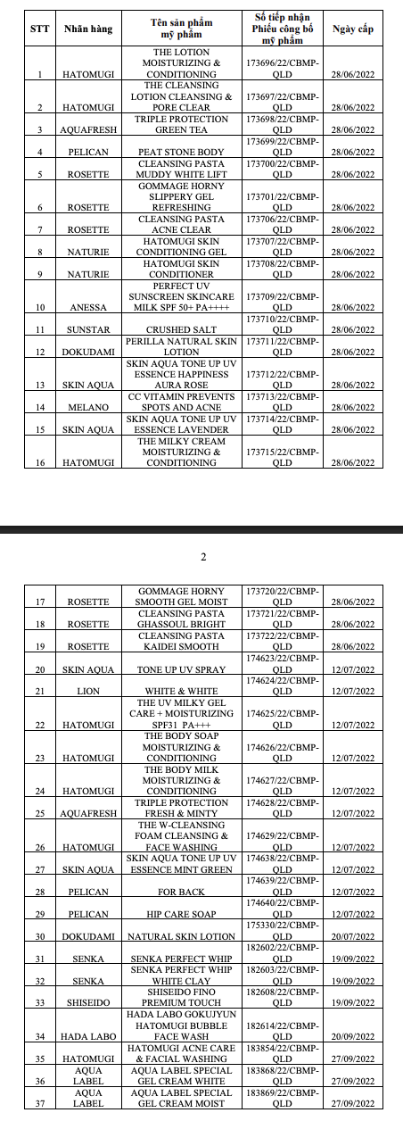 Danh sách sản phẩm bị thu hồi ghi nhận nhiều thương hiệu quen thuộc trên thị trường như: Hatomugi, Skin Aqua, Anessa, Senka, Hada Labo, Shiseido, Aquafresh, Rosette,… trải dài từ nhóm chăm sóc da, làm sạch đến các dòng kem chống nắng phổ biến. Đây đều là những sản phẩm từng được người tiêu dùng ưa chuộng, đặc biệt trong phân khúc mỹ phẩm Nhật Bản.