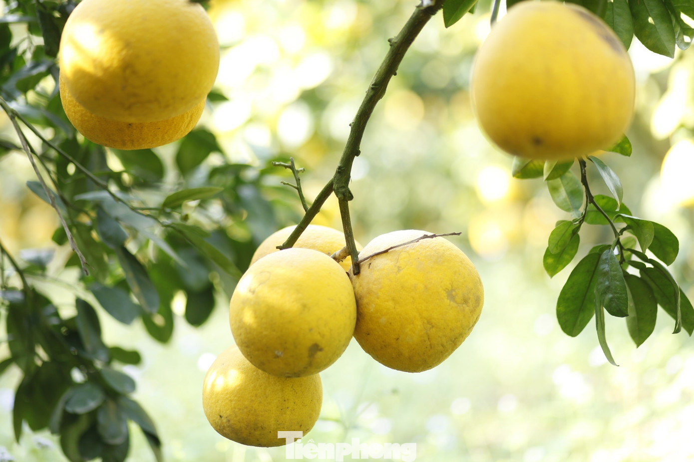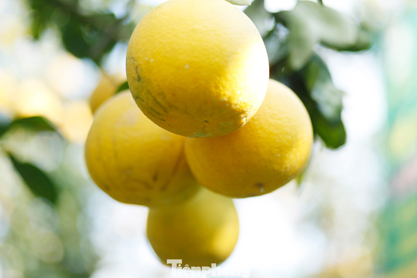 Vườn có 700 cây bưởi diễn và bưởi da xanh. Năm nay, gia đình ông Én ước tính khoảng 10 tấn bưởi da xanh và 5 vạn quả bưởi diễn bán dịp Tết.