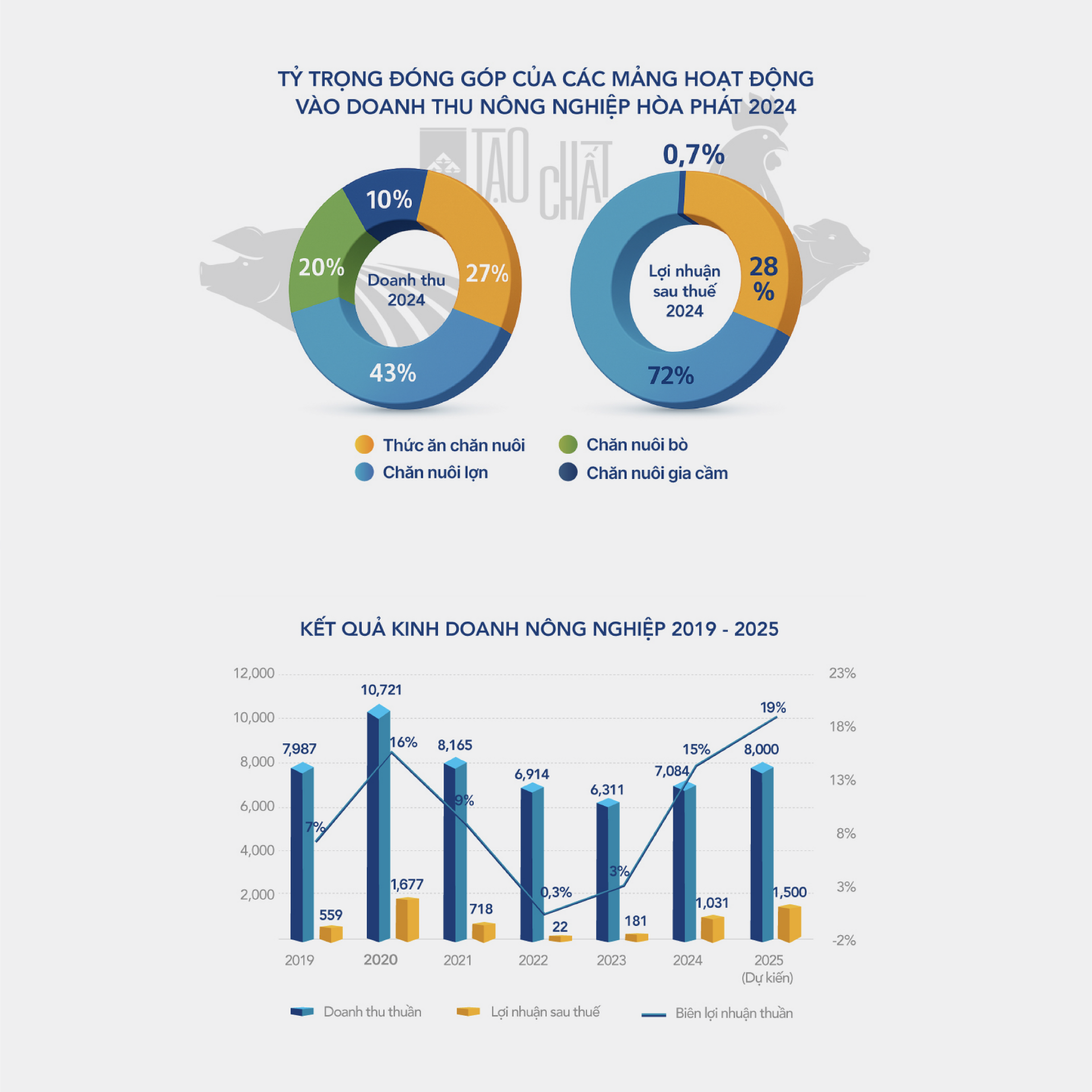 Hiện tại, nông nghiệp là mảng đóng góp doanh thu lớn thứ hai cho Tập đoàn Hòa Phát, sau thép. Năm 2024, doanh thu thuần đạt 7.084 tỷ đồng - tăng 12,2% so với năm 2023. Trong 6 tháng đầu năm 2025, công ty đã ghi nhận 4.325 tỷ doanh thu - tăng mạnh so với cùng kỳ và bằng 61% cả năm 2024. Lợi nhuận sau thuế 6 tháng đầu năm 2025 tăng vọt lên 939 tỷ đồng, gấp 2,3 lần cùng kỳ năm trước.