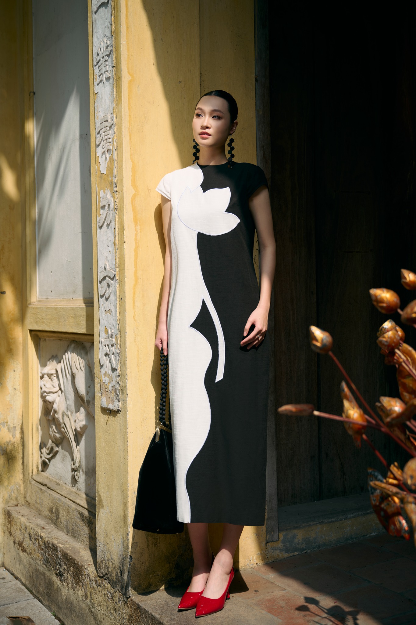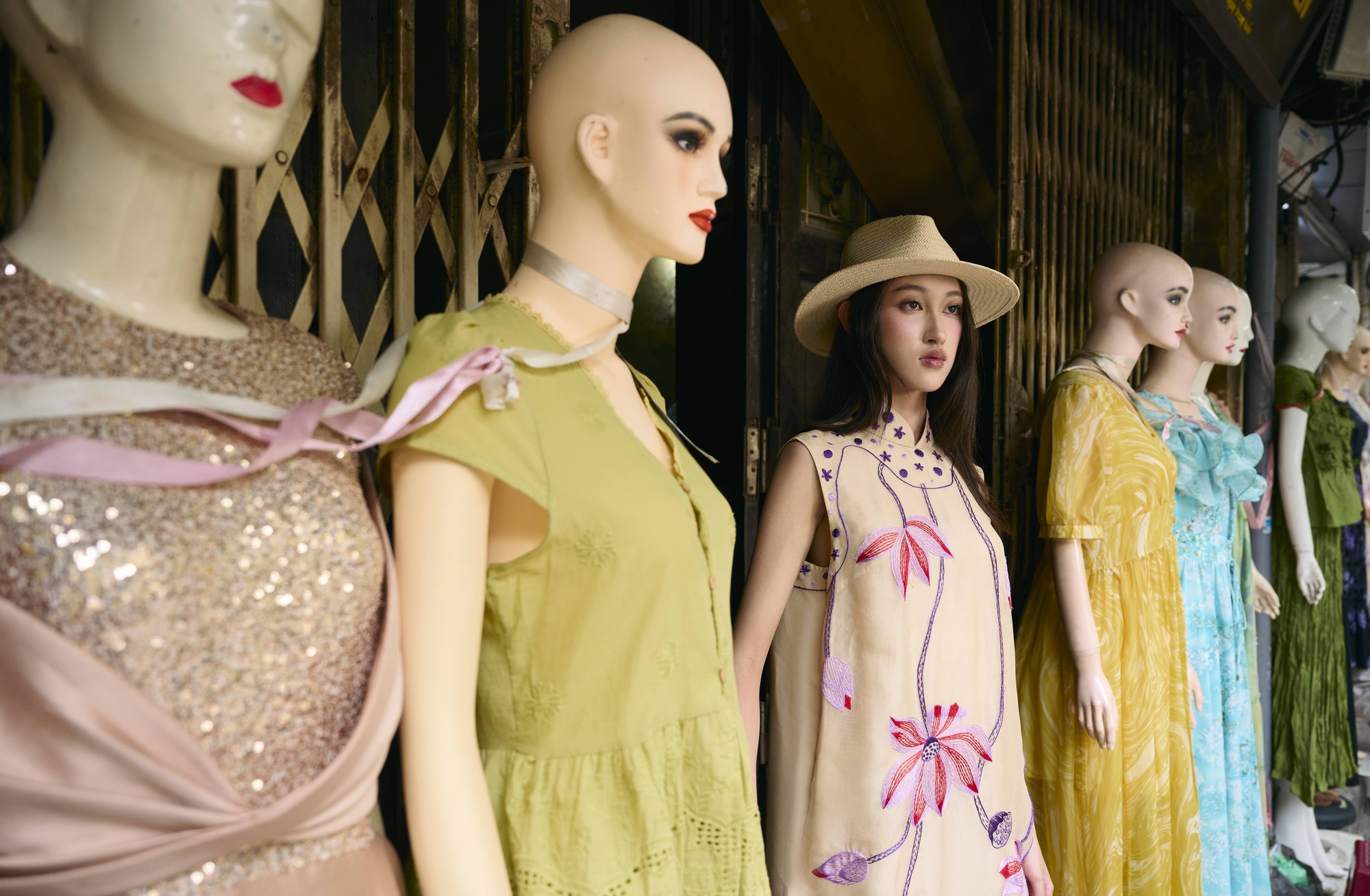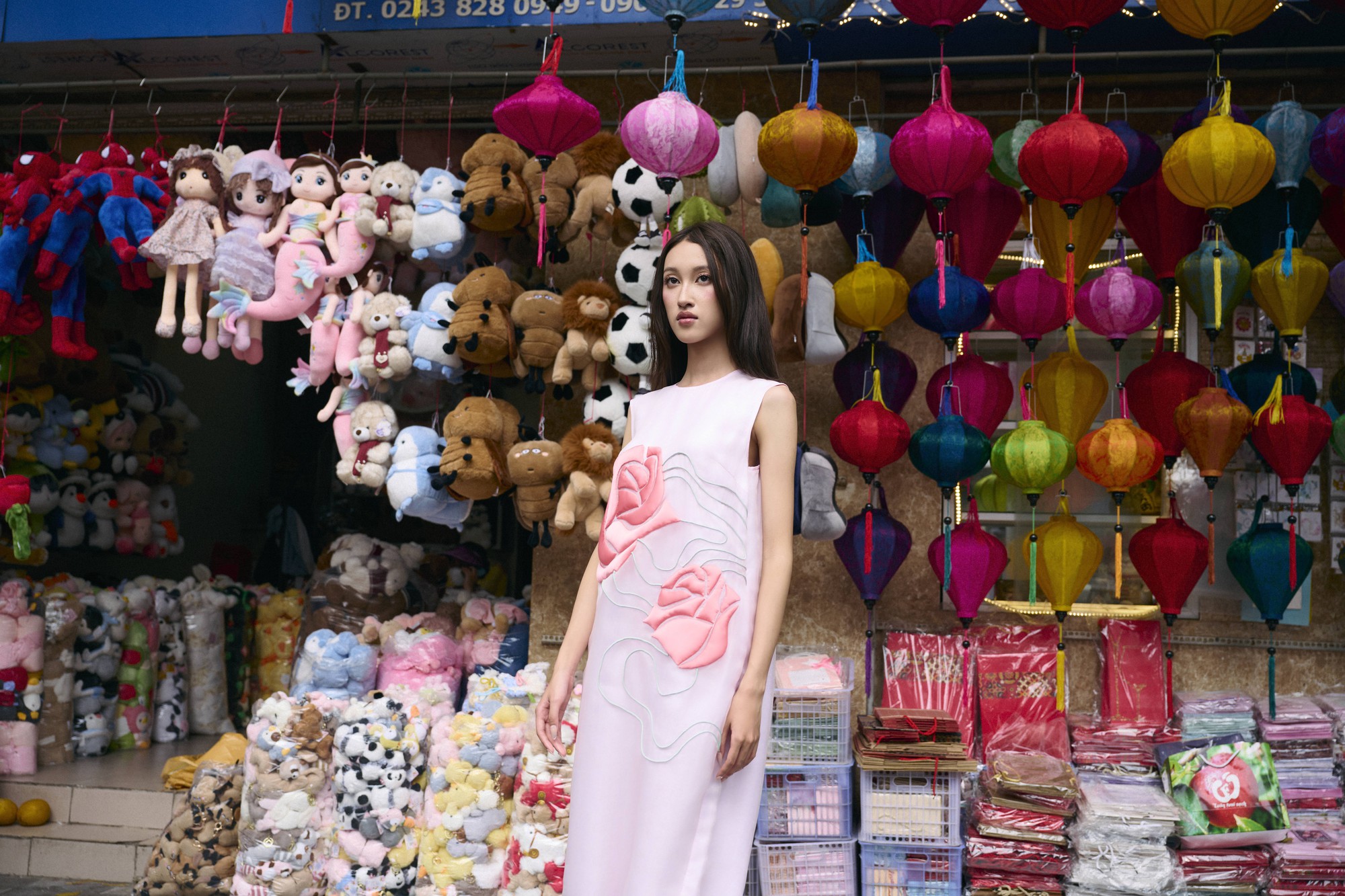 Những phom dáng gợi nhắc áo dài, chất liệu nhung, lụa cùng các chi tiết thủ công như hoa 3D, họa tiết nổi hay trừu tượng được đặt trong bối cảnh phố xá, tạo nên sự giao thoa giữa di sản và nhịp sống hiện đại.