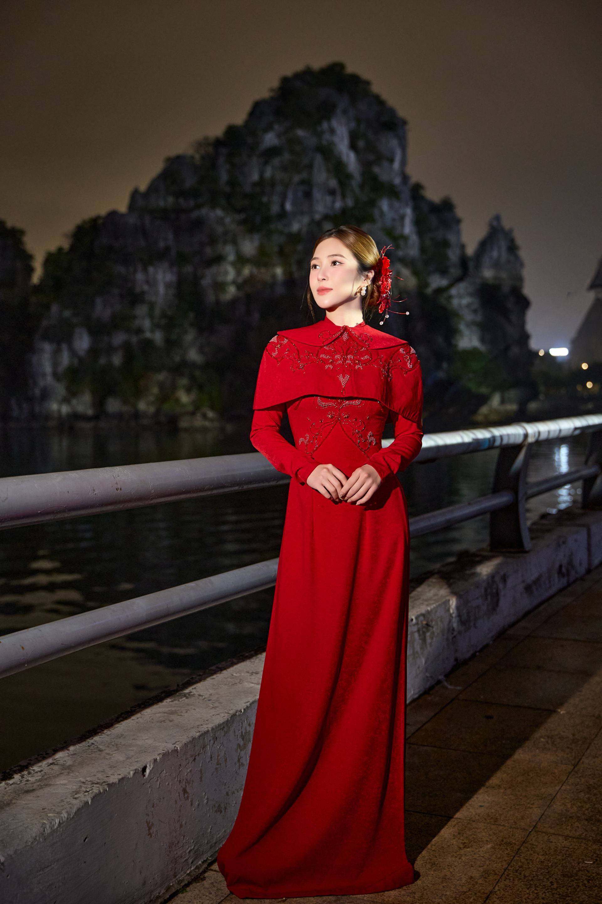 Hương Tràm xuất hiện trong tà áo dài đỏ, lựa chọn cách thể hiện tiết chế, tập trung vào giọng hát (Ảnh: FBNV)