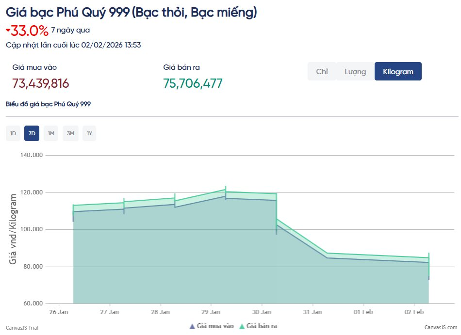 Theo dữ liệu của Tập đoàn Vàng bạc Đá quý Phú Quý, trong phiên sáng, bạc thỏi 999 loại 1 kg được niêm yết ở mức 84,03 triệu đồng/kg mua vào và 86,61 triệu đồng/kg bán ra. Tuy nhiên, chỉ đến đầu giờ chiều cùng ngày, giá bạc thỏi đã được điều chỉnh giảm mạnh, xuống còn khoảng 73,44 triệu đồng/kg mua vào và 75,71 triệu đồng/kg bán ra.