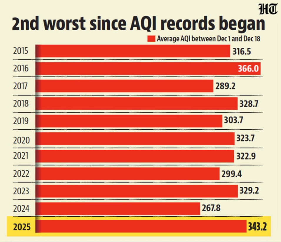 Chỉ số chất lượng không khí trung bình (AQI) của tháng đã tăng lên 343, mức tồi tệ thứ hai trong tháng cùng kỳ kể từ năm 2015 trở đi, khi CPCB bắt đầu công bố các bản tin này. Chỉ có năm 2016 ghi nhận mức trung bình cao hơn, ở mức 366. Nếu so sánh từ năm 2018 trở đi, chất lượng không khí trong 18 ngày đầu tháng 12 năm nay là ô nhiễm nhất được ghi nhận.
