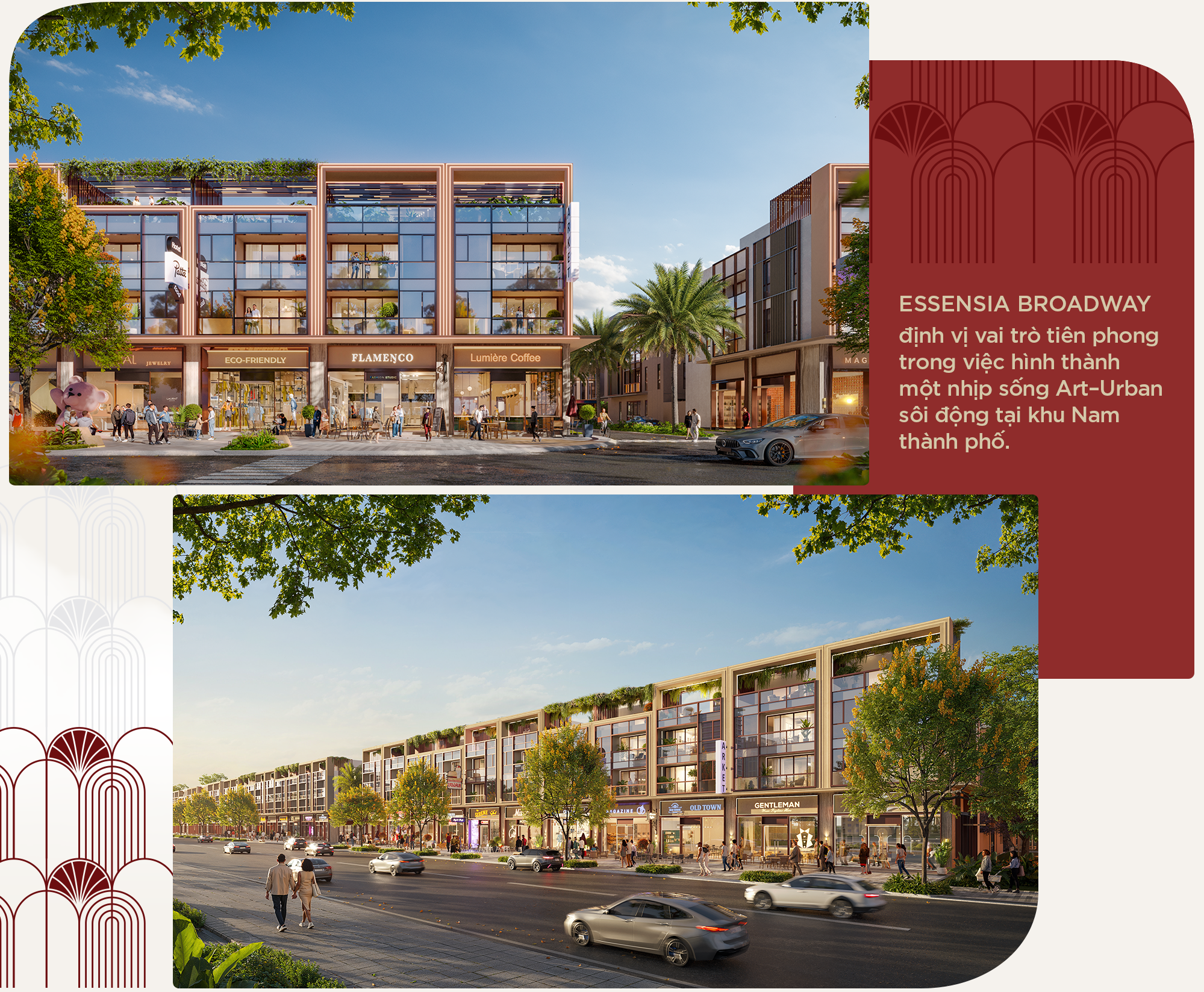 Trên quy mô hơn 25.000m², dự án quy tụ 31 căn nhà phố thương mại và 56 căn nhà phố liền kề với biên độ diện tích linh hoạt nhằm đáp ứng hài hòa nhu cầu an cư, đầu tư. Các nhóm sản phẩm này được bố trí chặt chẽ với hệ thống không gian chức năng nội khu, tạo nên dòng chảy trải nghiệm xuyên suốt từ kết nối giao thương, sinh hoạt cộng đồng đến đời sống cá nhân. Để dòng chảy được liền mạch, Essensia Broadway chọn Art-Deco làm ngôn ngữ kiến trúc chủ đạo. Những mảng khối rành mạch, nhịp điệu hình học rõ nét cùng giải pháp ánh sáng tinh tế trở thành nền tảng dệt nên một diện mạo đô thị hiện đại, sang trọng và giàu cảm xúc.