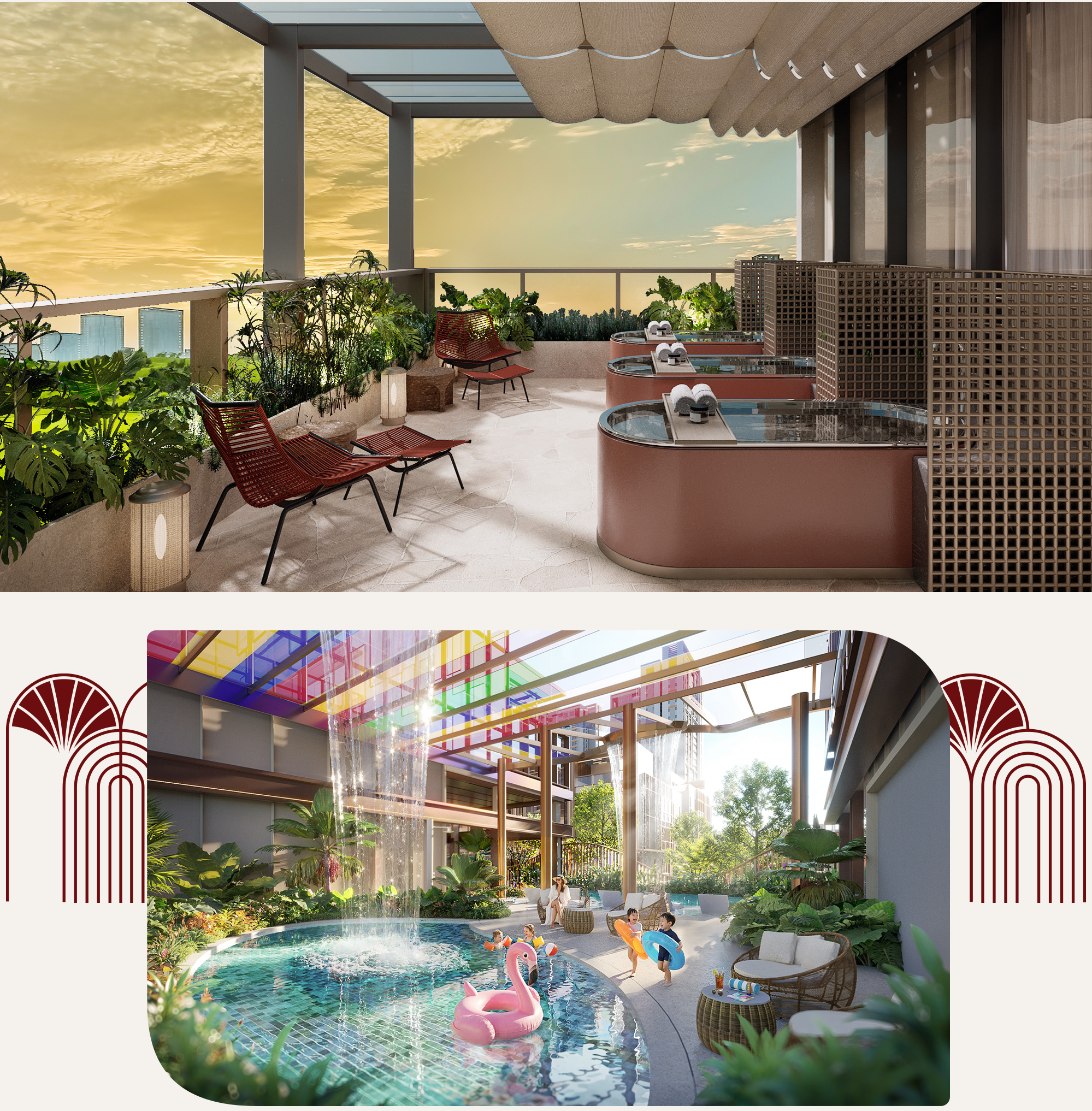 Không đơn thuần là một công trình kiến trúc đậm tính duy mỹ, các tiện ích tại Clubhouse được thiết kế tỉ mỉ để mang lại trải nghiệm hoàn hảo cho cư dân, tương tự như cuộc sống của giới thượng lưu phương Đông trong vở nhạc kịch Aladdin. Nổi bật trong đó là hệ hồ bơi đa lớp ngay mặt tiền với hồ bơi thác nước sợi quang học phục vụ nhu cầu vận động nhẹ nhàng và thư giãn, cạnh bên là khu vui chơi dưới nước sinh động dành cho các cư dân nhí. Bể sục Jacuzzi được bố trí tách biệt, giúp cư dân thả lỏng cơ thể sau một ngày dài.
