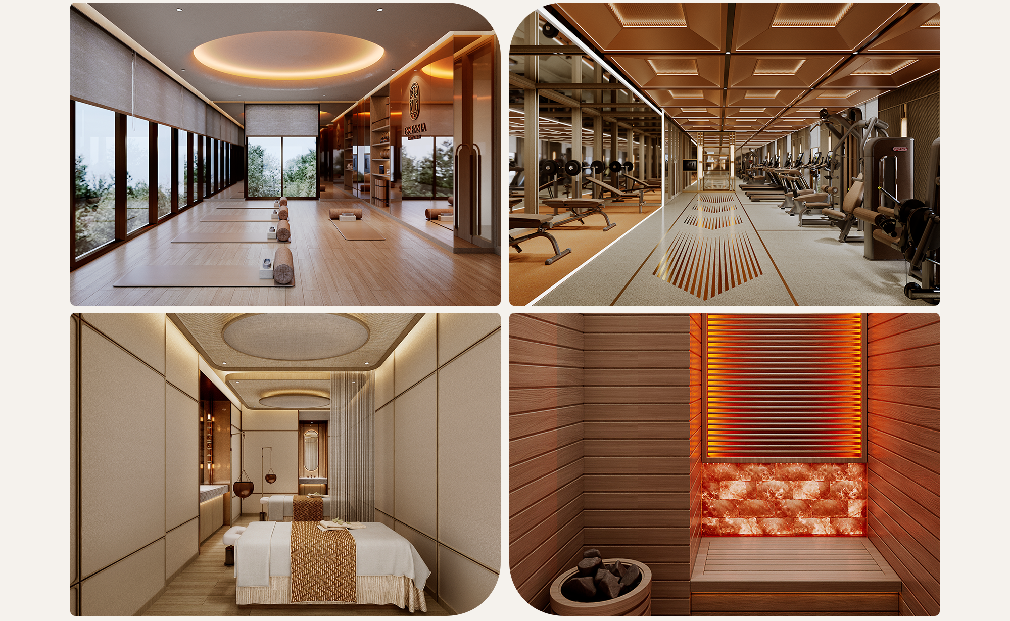 Trên tầng, phòng tập thể thao luôn sẵn sàng phục vụ nhu cầu rèn luyện thể chất. Phòng gym với đầy đủ các loại máy móc hiện đại, phòng tập yoga được thiết kế tối giản, màu sắc ấm cúng và hệ cửa lớn để ánh sáng và nhịp thở của thiên nhiên len vào từng chuyển động. Với những cư dân yêu thích bộ môn golf, phòng golf giả lập mang đến điều kiện luyện tập linh hoạt mỗi ngày. Liền kề các không gian vận động là khu spa và phòng xông hơi đá nóng, hoàn thiện hành trình tái tạo năng lượng giữa những lịch trình bận rộn.