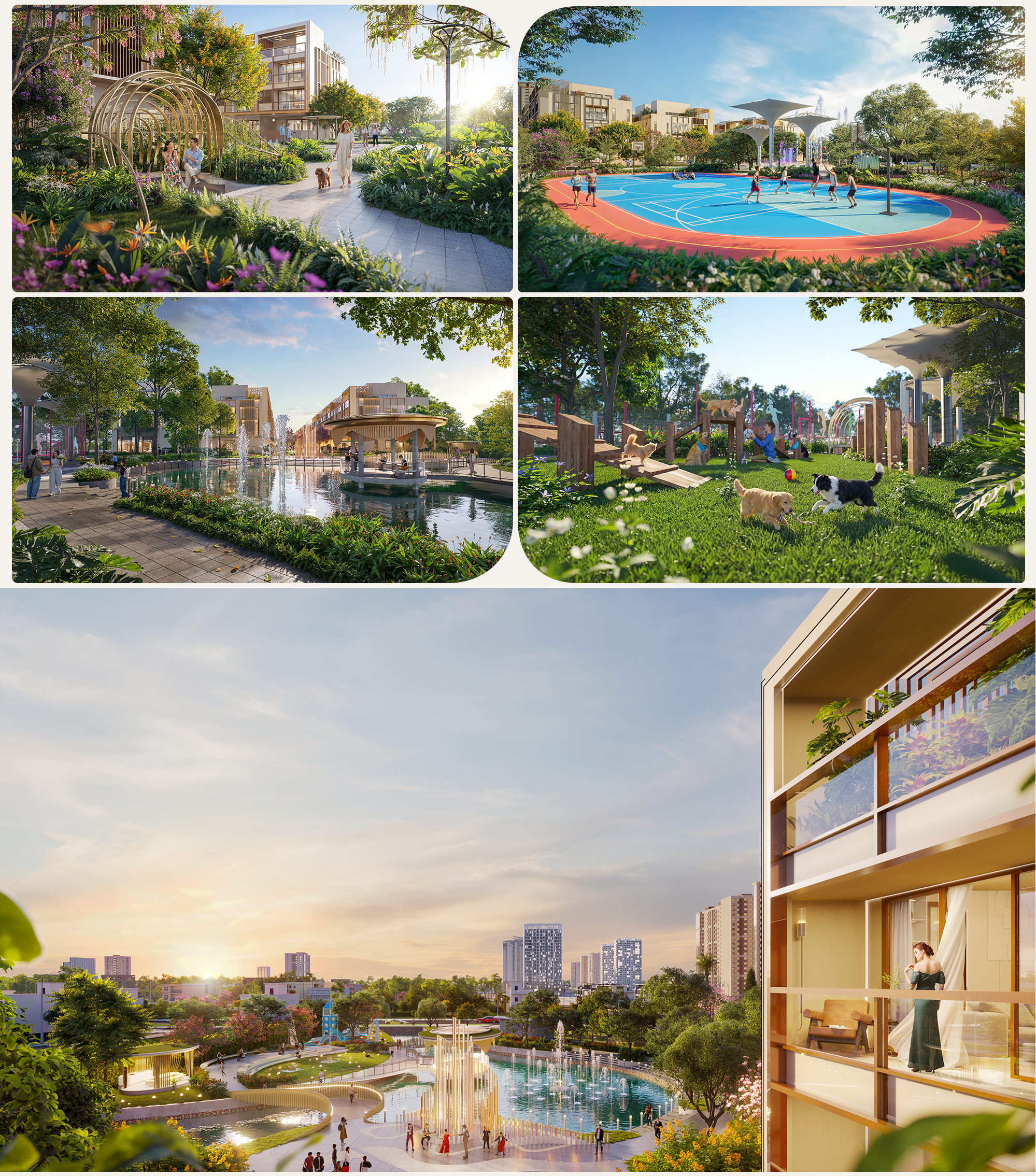 Để bức tranh trọn vẹn hơn, Essensia Broadway hoàn thiện nhịp sống cư dân bằng tổ hợp công viên và quảng trường Broadway rộng hơn 3.000m² – một không gian mở đóng vai trò cân bằng cho toàn khu. Tại đây, nhịp sống được mở rộng theo chiều ngang với quảng trường nhạc nước, khán đài ngoài trời, cầu đi bộ ngắm cảnh, đường chạy bộ, sân chơi trẻ em, công viên thú cưng, khu BBQ và vườn trị liệu được phân bổ thành từng phân khu chức năng rõ ràng. Mỗi không gian là một trải nghiệm độc lập, nhưng khi đặt cạnh nhau, chúng bổ trợ và cộng hưởng cho nhau.