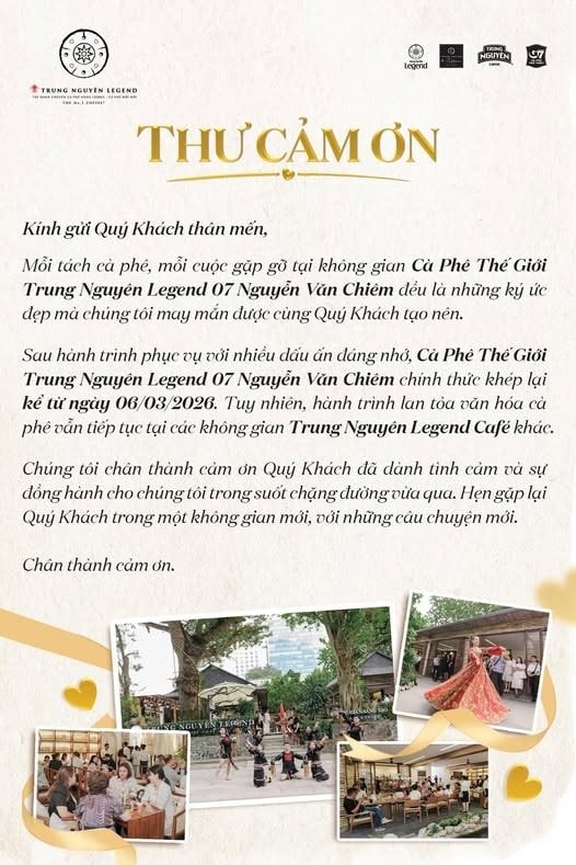 Trung Nguyên Legend vừa phát đi thông báo chính thức về việc dừng hoạt động không gian Cà phê Thế Giới Trung Nguyên Legend tại địa chỉ 07 Nguyễn Văn Chiêm (TP.HCM) kể từ ngày 6/3/2026, khép lại hành trình của một điểm hẹn quen thuộc giữa trung tâm thành phố.